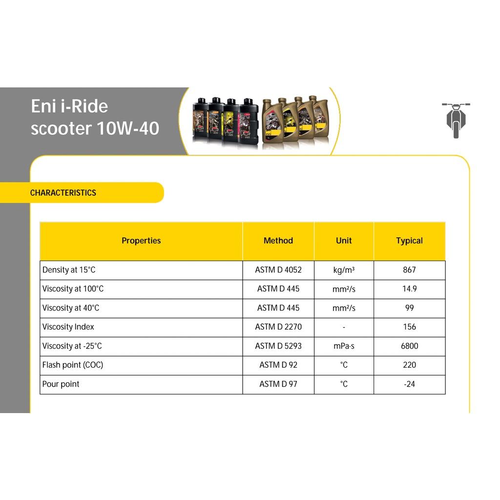 ENI I-RIDE SCOOTER MB 10W-40 là loại dầu nhớt chất lượng cao chuyên dụng cho xe tay ga (honda, yamaha, piaggio) Tính chất . Cấp nhớt: JASO MB | API SL . Phân loại: Nhớt
