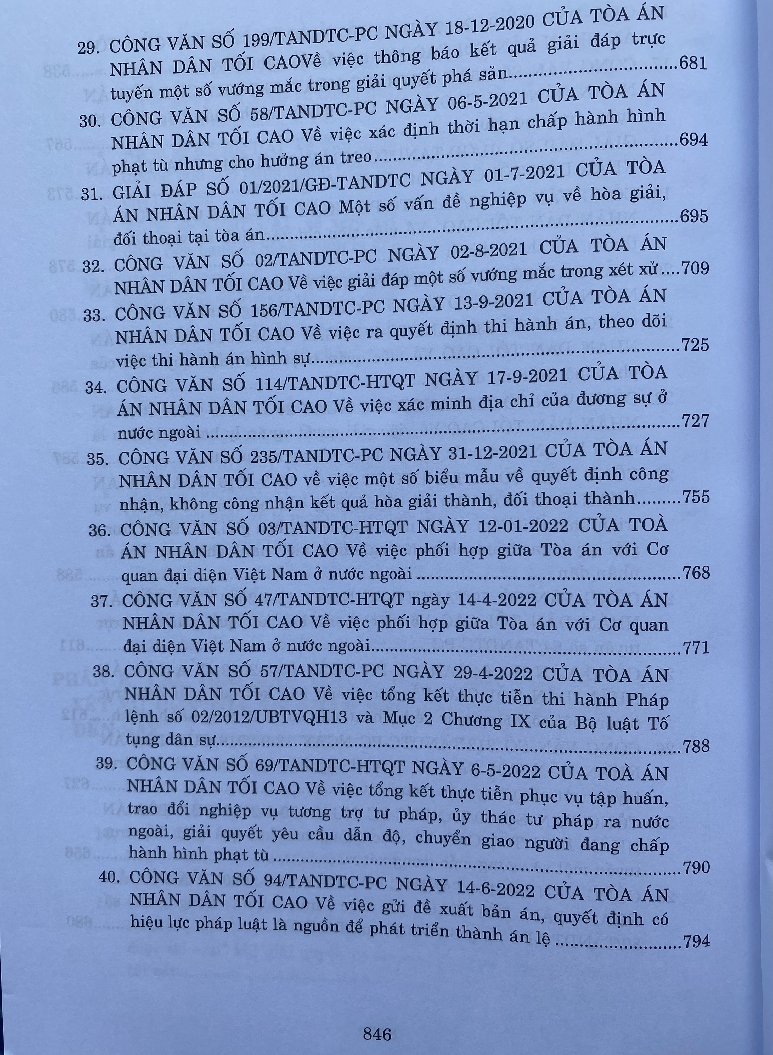 Án lệ là kết quả của quá trình nghiên cứu, xây dựng pháp luật, tạo thêm hành lang pháp lý cho Thẩm phán xem xét và áp dụng trong xét xử. Án lệ được công bố và áp dụng tại Việt Nam sẽ góp phần giải quyết những khó khăn, vướng mắc trong công tác xét xử, bảo đảm áp dụng thống nhất pháp luật, công bằng, minh bạch để chất lượng xét xử ngày được nâng cao. Ngày 01-10-2023, Tòa án nhân dân tối cao đã ban hành Quyết định 364/QĐ-CA về việc công bố án lệ. Công bố 07 án lệ đã được Hội đồng Thẩm phán Tòa án nhân dân tối cao thông qua, bao gồm: Án lệ số 64/2023/AL về định khung hình phạt và tính tiết định khung tăng nặng “có tổ chức” trong tội “Bắt cóc nhằm chiếm đoạt tài khoản”; Án lệ số 65/2023/AL về truy cứu trách nhiệm hình sự tội “Mua bán người”; Án lệ số 66/2023/AL về việc xác định tội danh “Mua bán người”; Án lệ số 67/2023/AL về người được nhận hiện vật khi chia tài sản chung; Án lệ số 68/2023/AL về quyền nhận di sản bằng hiện vật là nhà ở của người thừa kế là người Việt Nam định cư ở nước ngoài; Án lệ số 69/2023/AL về thẩm quyền của Trọng tài thương mại trong việc giải quyết tranh chấp thỏa thuận bảo mật thông tin và không cạnh tranh; Án lệ số 70/2023/AL về việc chấm dứt hợp đồng lao động đối với người lao động là cán bộ công đoàn không chuyên trách. Như vậy, đến nay đã có tổng cộng 70 án lệ (Án lệ số 1 đến Án lệ số 70) đã được Hội đồng Thẩm phán Tòa án nhân dân tối cao thông qua. Bên cạnh đó, Tòa án nhân dân tối cao cũng ban hành nhiều văn bản giải đáp nhằm tháo gỡ các vướng mắc trong xét xử về hình sự, dân sự, tố tụng hình sự, tố tụng dân sự, hành chính, kinh doanh thương mại. Các văn bản giải đáp tổng hợp nhiều vấn đề nghiệp vụ, ngoài ra Tòa án nhân dân tối cao còn ban hành các công văn hướng dẫn nghiệp vụ đối với một vấn đề cụ thể.