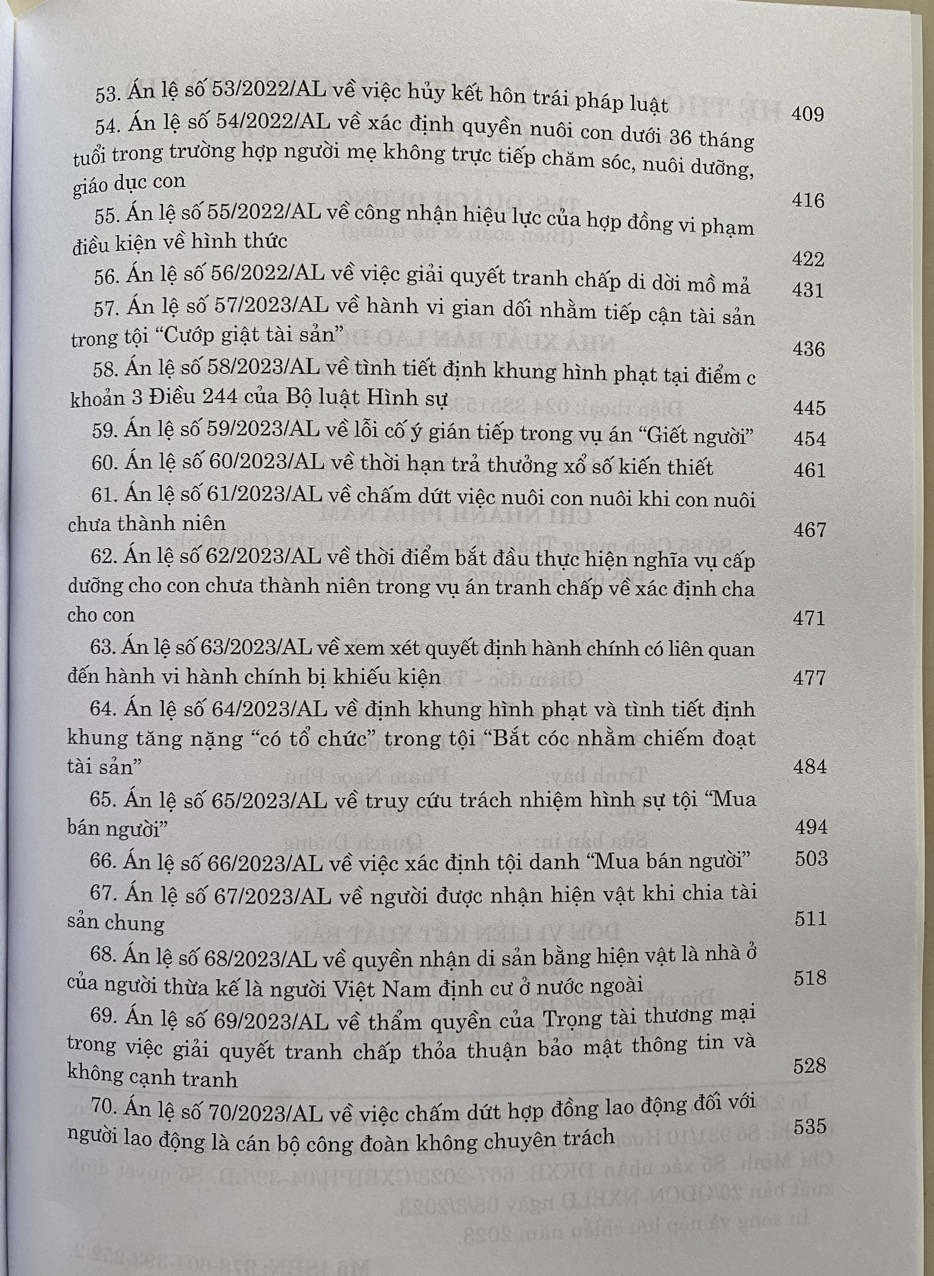 Để thuận tiện cho việc nghiên cứu, tìm hiểu, vận dụng án lệ trong quá trình thực hiện nhiệm vụ xét xử của Tòa án; giúp các cơ quan, tổ chức, cá nhân quan tâm tới hoạt động của Tòa án có thể tiếp cận với các án lệ đã ban hành; tạo nguồn tham khảo cho các hoạt động giảng dạy, nghiên cứu khoa học của các cơ quan, tổ chức, cá nhân, Nhà xuất bân Lao Động cho xuất bản và phát hành cuốn: "Hệ thống Án lệ Việt Nam (Hiện hành) - Từ Án lệ số 01 đến Án lệ số 70".