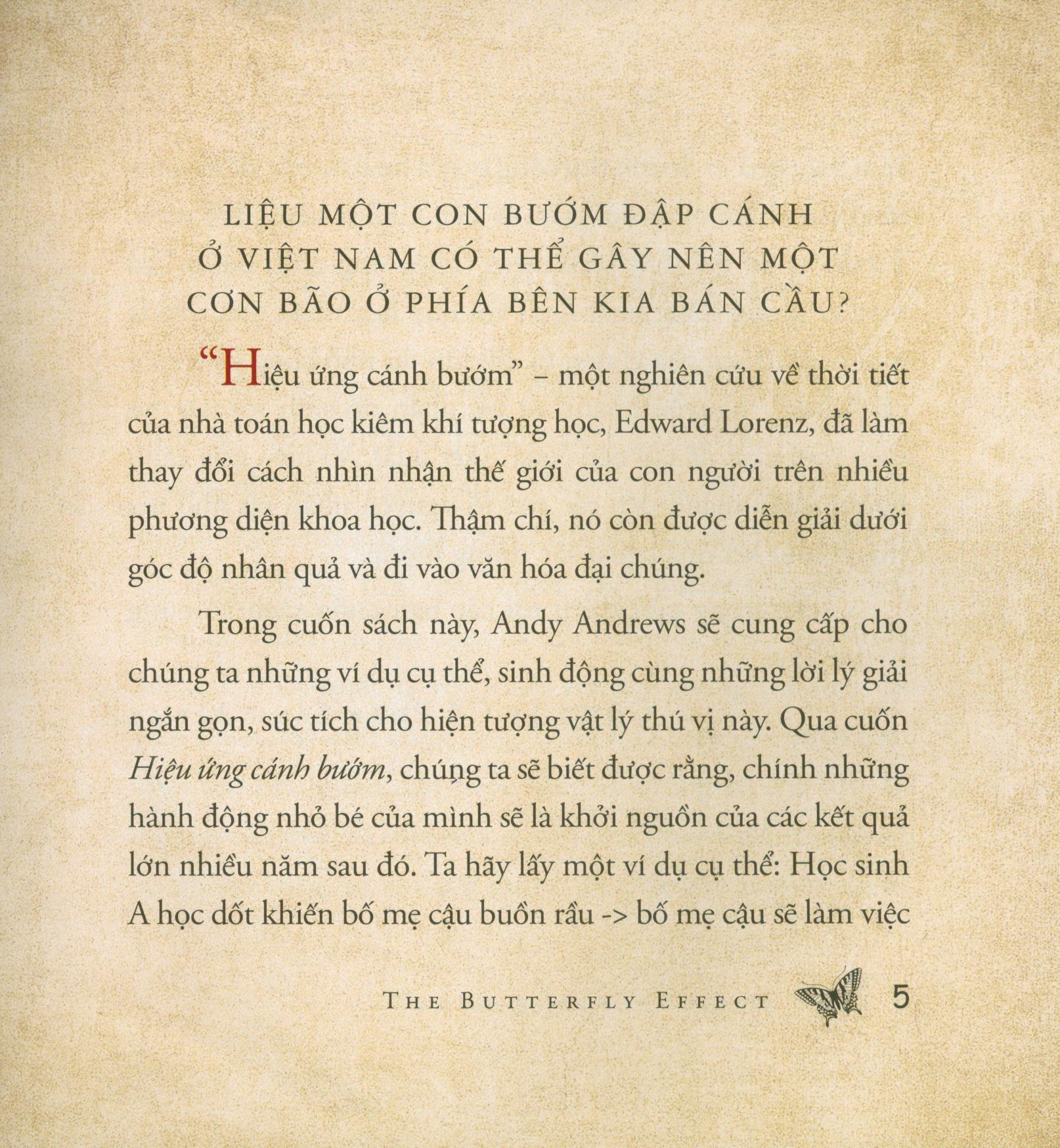 Trong cuốn sách Hiệu Ứng Cánh Bướm này, Andy Andrews sẽ cung cấp cho chúng ta những ví dụ, cụ thể, sinh động cùng những lời lý giải ngắn gọn, súc tích cho hiện tượng vật lý thú vị này. Chúng ta sẽ biết rằng, chính những hành động nhỏ bé của mình sẽ là khởi nguồn của các kết quả lớn nhiều năm sau đó.