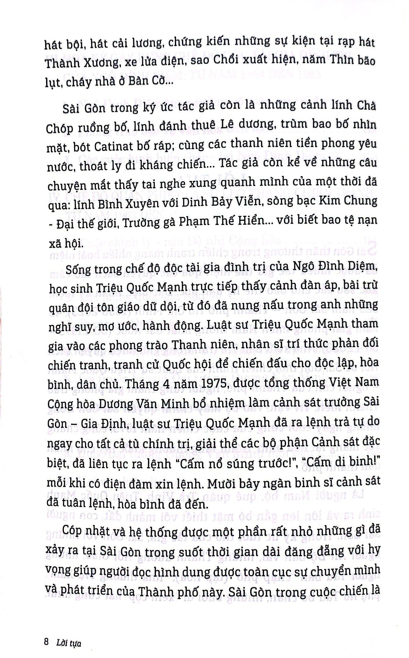 Sách Hồi ức Sài Gòn thời chiến tranh do Luật sư Triệu Quốc Mạnh - người sinh ra và lớn lên tại Sài Gòn, hoạt động trong phong trào đấu tranh phản chiến viết. Sài Gòn trong cuộc chiến qua hồi ức của tác giả là một tuyến đầu vĩ đại, một công sự vĩ đại, đồng bào nơi đây vừa đấu tranh vừa đùm boc, vừa xây dựng để cuối cùng có được một thành quả cũng thật sự vĩ đại, một Sài Gòn tuyệt đẹp, lẫy lừng.