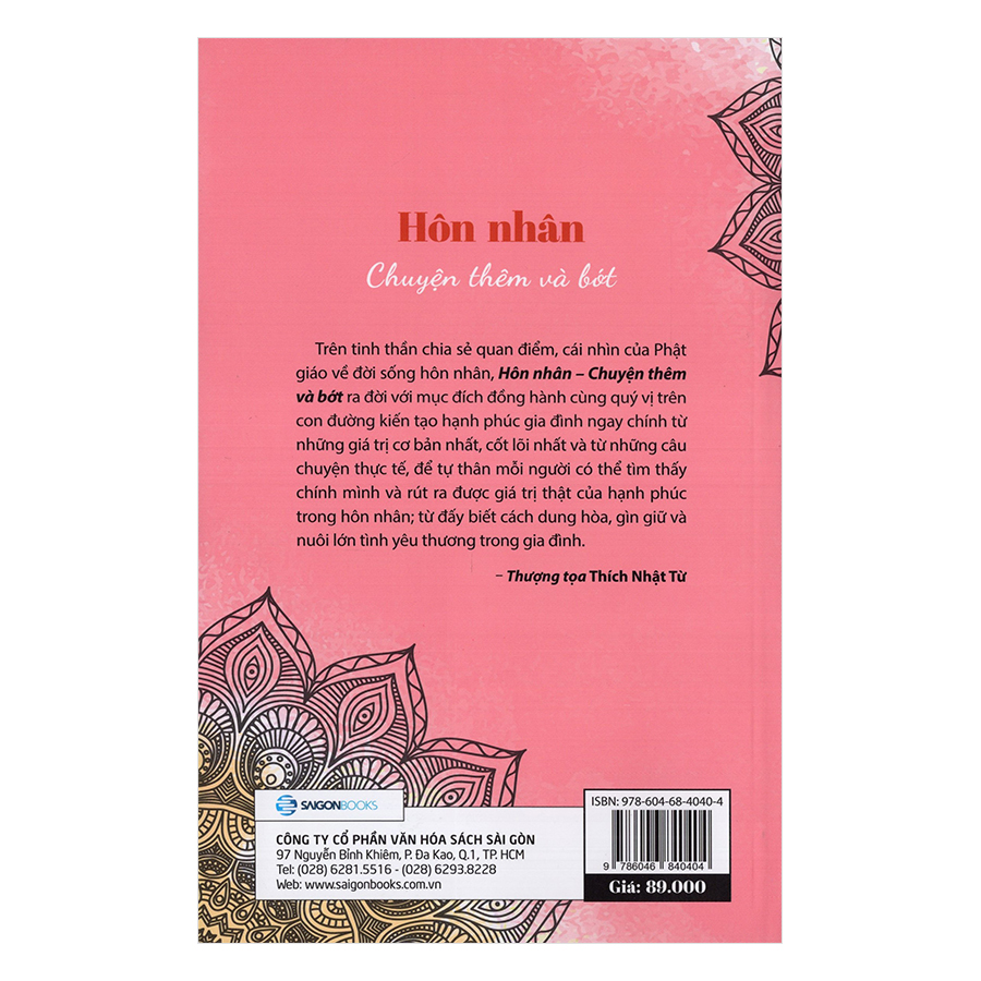 Ở thời điểm hiện tại, nếu chúng ta muốn tìm một cuốn sách nói về hạnh phúc gia đình, hoặc những cuốn sách viết về Phật giáo và tâm linh thì có lẽ không phải mất quá nhiều công sức; nhưng sẽ không hề đơn giản nếu tìm một cuốn cẩm nang về hạnh phúc gia đình qua cái nhìn từ bi, minh triết của giáo lý Phật pháp. Trên tinh thần chia sẻ quan điểm, cái nhìn của Phật giáo về đời sống hôn nhân, "Hôn nhân – Chuyện thêm và bớt" ra đời với mục đích đồng hành cùng quý vị trên con đường kiến tạo hạnh phúc gia đình ngay chính từ những giá trị cơ bản nhất, cốt lõi nhất và từ những câu chuyện thực tế, để tự thân mỗi người có thể tìm thấy chính mình và rút ra được giá trị thật của hạnh phúc trong hôn nhân; từ đấy biết cách dung hòa, gìn giữ và nuôi lớn tình yêu thương trong gia đình.