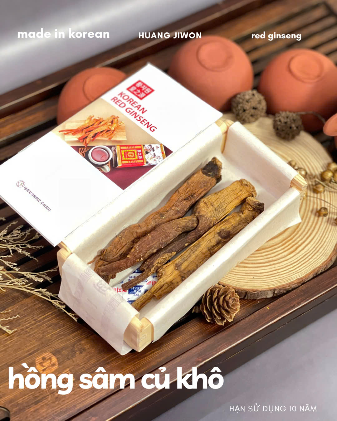 - 100% nhân sâm Hàn Quốc qua quá trình hấp sấy thành hồng sâm củ khô nguyên chất, được sấy khô và đóng hộp gỗ bên trong hộp thiếc bên ngoài đẹp sang. Công dụng: