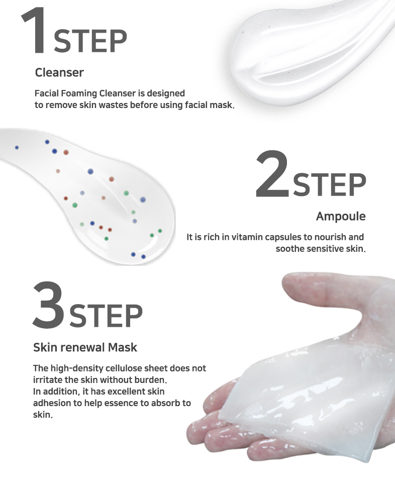 1 hộp mặt nạ gồm: - 1Step - Cleanser: sửa rữa mặt làm sạch da, loại bỏ bụi bẩn (10 tép x 1.5 ml) - 2Step - Ampolue: Nuôi dưỡng & làm dịu da nhạy