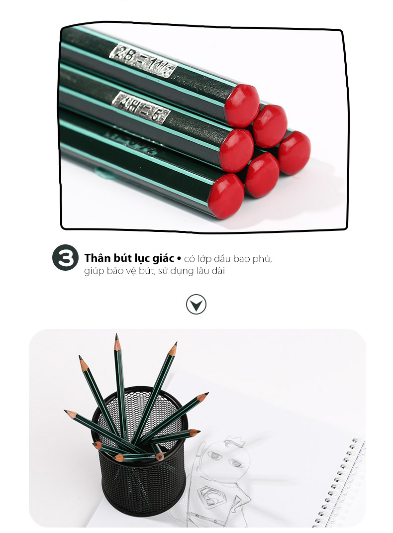 Mua tại Tiktok️ Ruột chì mềm, nét đậm tùy thuộc vào các độ. ️ Thân gỗ mềm dễ chuốt, có thể sử dụng dao chuốt, gọt chì ️ Bút dùng để viết, vẽ phác thảo trên nhiều
