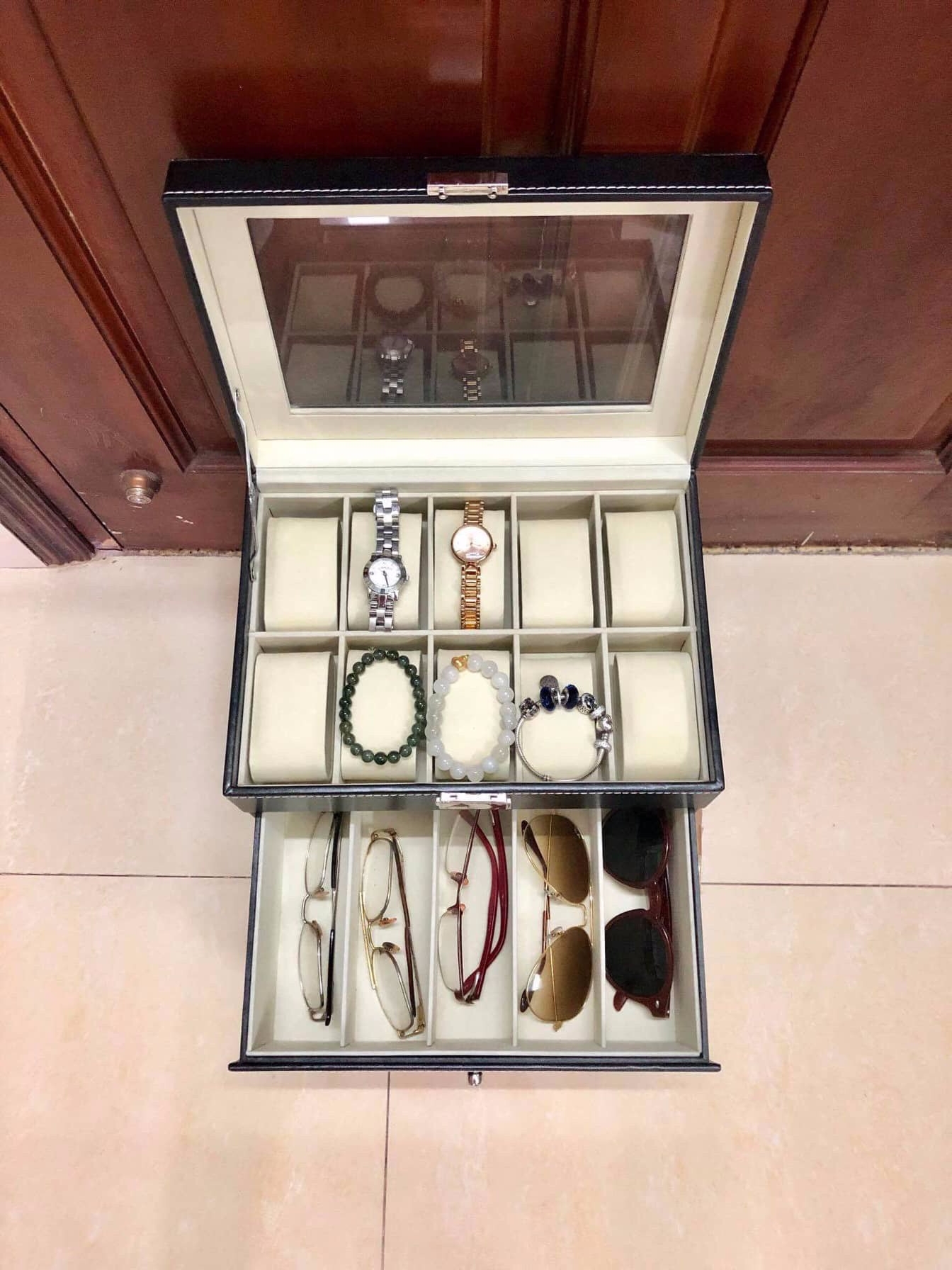 Bạn có khoảng 6-8 chiếc đồng hồ và phụ kiện trang sức như nhẫn, vòng ùng với đó bạn thích hộp có mặt kính để nhìn thấy phụ kiện bên trong hộp và hộp có