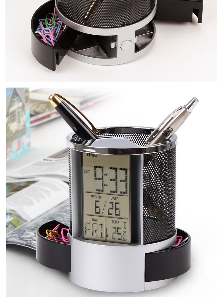 Khay đựng bút có đồng hồ lịch kỹ thuật số để bàn đa chức năng.