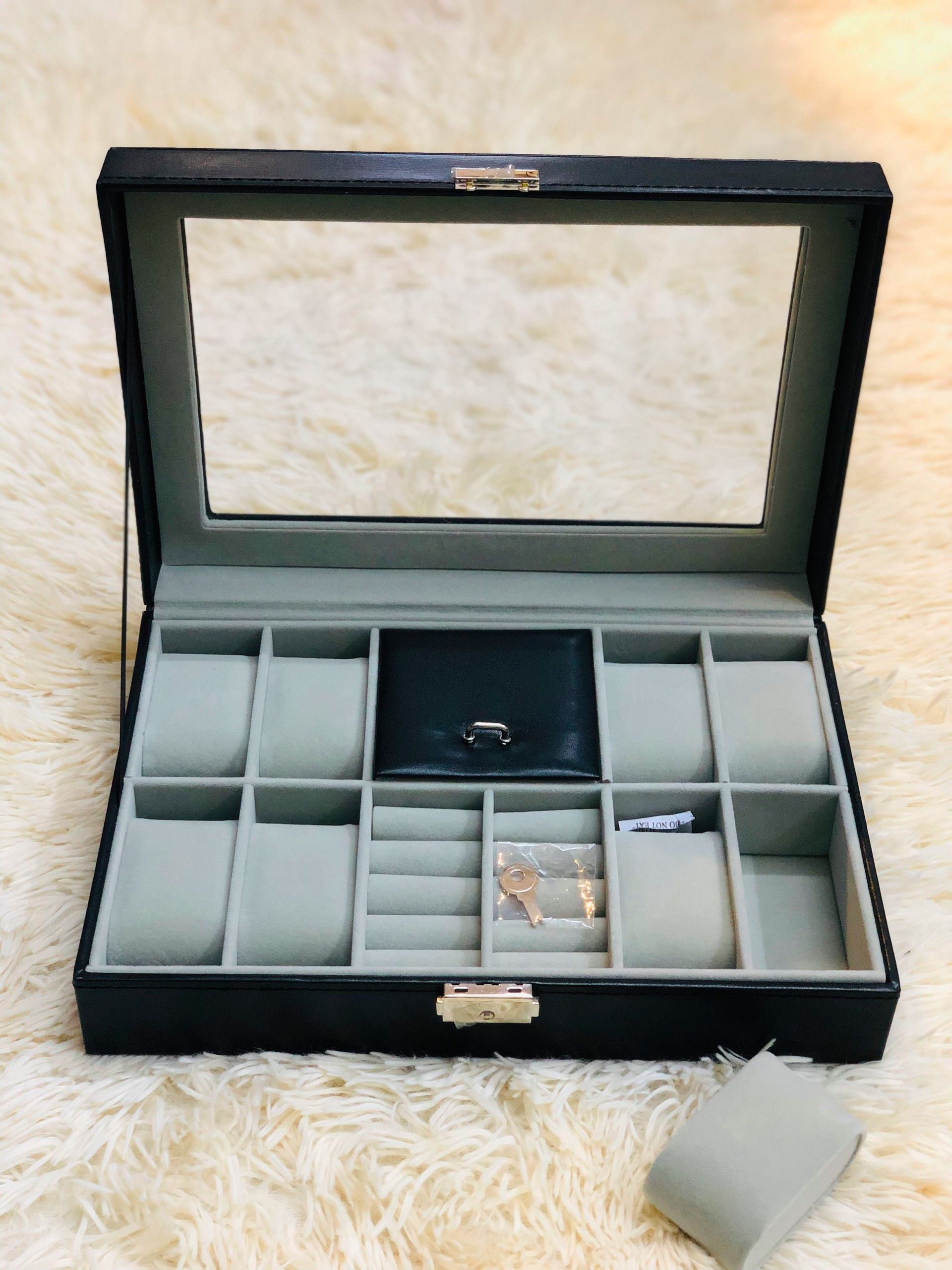 - Hộp có nắp kính, sẵn cục mút để đồng hồ, có khóa chìa