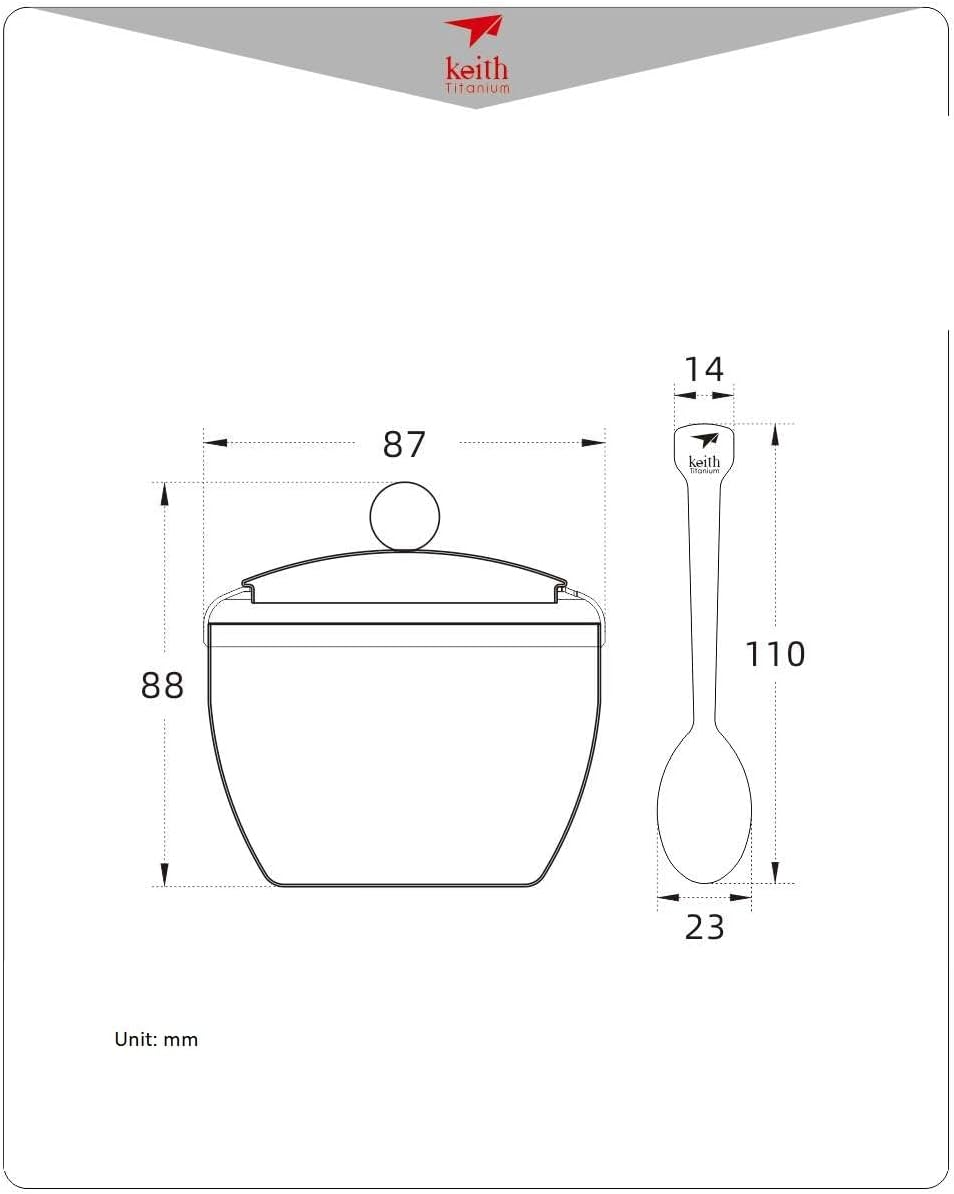 THÔNG TIN SẢN PHẨM: - Thương hiệu: Keith Titanium - Xuất xứ: Trung Quốc - Chất liệu: Titanium - Kích thước: Lọ đựng gia vị: Ø 87 × 85 mm Thìa: 23 × 110 mm