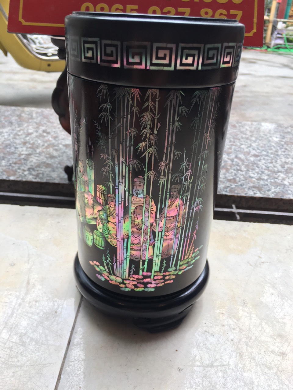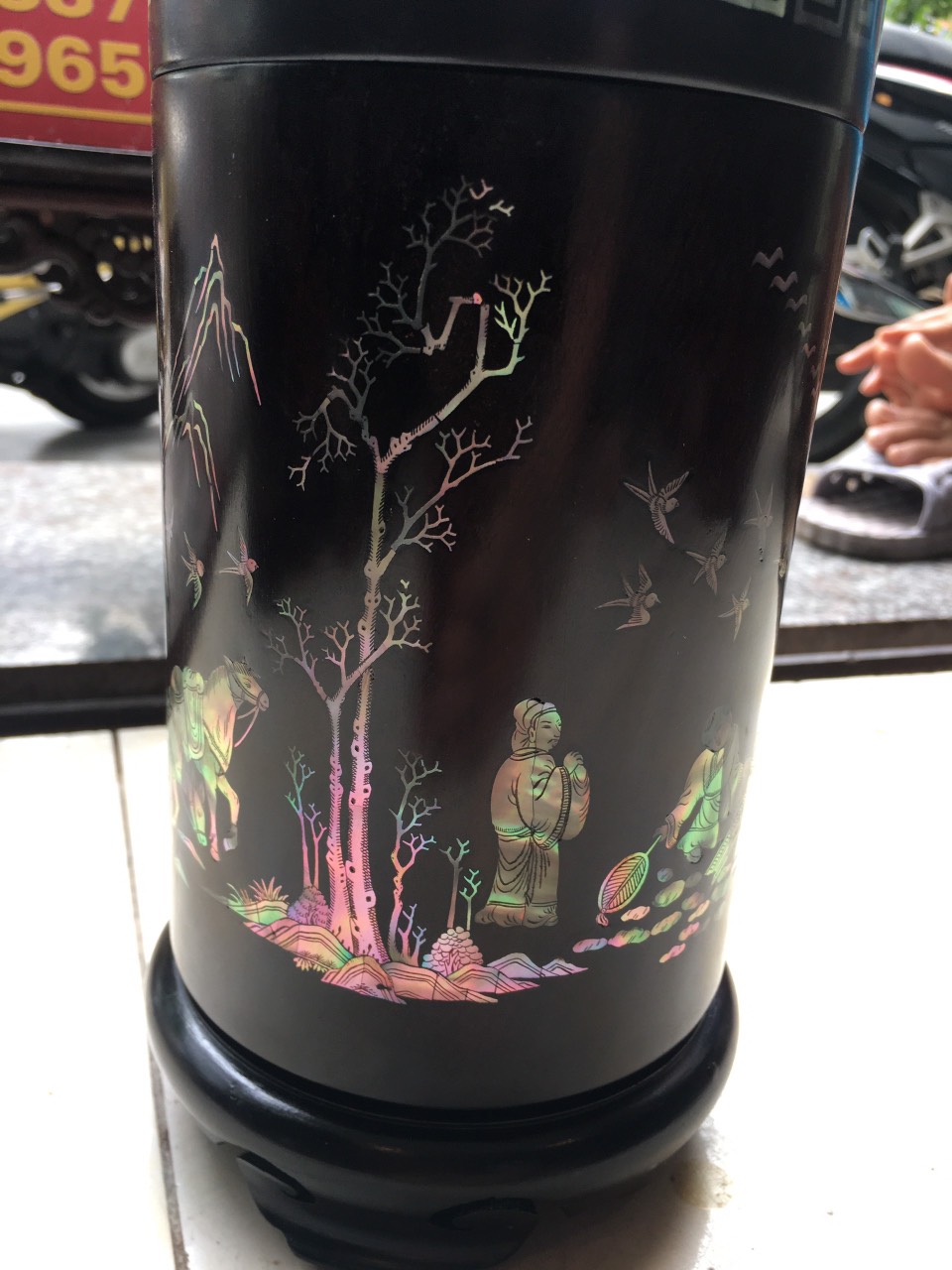 _ Hộ đựng trà được tiên khắc kết hợp với khảm ốc đỏ ,rất tỉ mỉ tinh sảo kỳ công ,Ốc đỏ là một loại ốc quý hiếm ,thường xuyên sinh sống ở những nước xa sôi như singgapo và nhật bản ,như ở việt nam biển rất nhiều lên không có ốc ,nếu có thì có rất ít lại không mầu ,Chính vì thế ốc thường được nhập khẩu từ singgapore về rất đắt đỏ ,những bù lại mầu sắc rất đỏ và đẹp ,và được rất nhiều người ưa chuộng cũng như muốn sử hữu 1 sẩn phẩm khảm ốc đỏ như khảm sập gụ tủ chè tranh ảnh ,đặt biệt khảm vào hộp đựng trà ,kết hợp với chất liệu thân gỗ trắc đỏ đen . Đã nâng tầm hộp trà chè với sự sang trọng được đánh giá cao .Hộp đựng trà chè được làm và hoàn thiện do bàn tay khối óc tài hoa từ những người thợ dầy rặn kinh nghiệm ,Cũng như tay nghề cao trong làng nghề truyền thống .Chính vì thế hộp đựng trà đã đáp ứng đầy đủ những tiêu trí ( Đẹp bền rẻ ) Thẩm mỹ nghệ thuật với chất lượng tuyệt vời