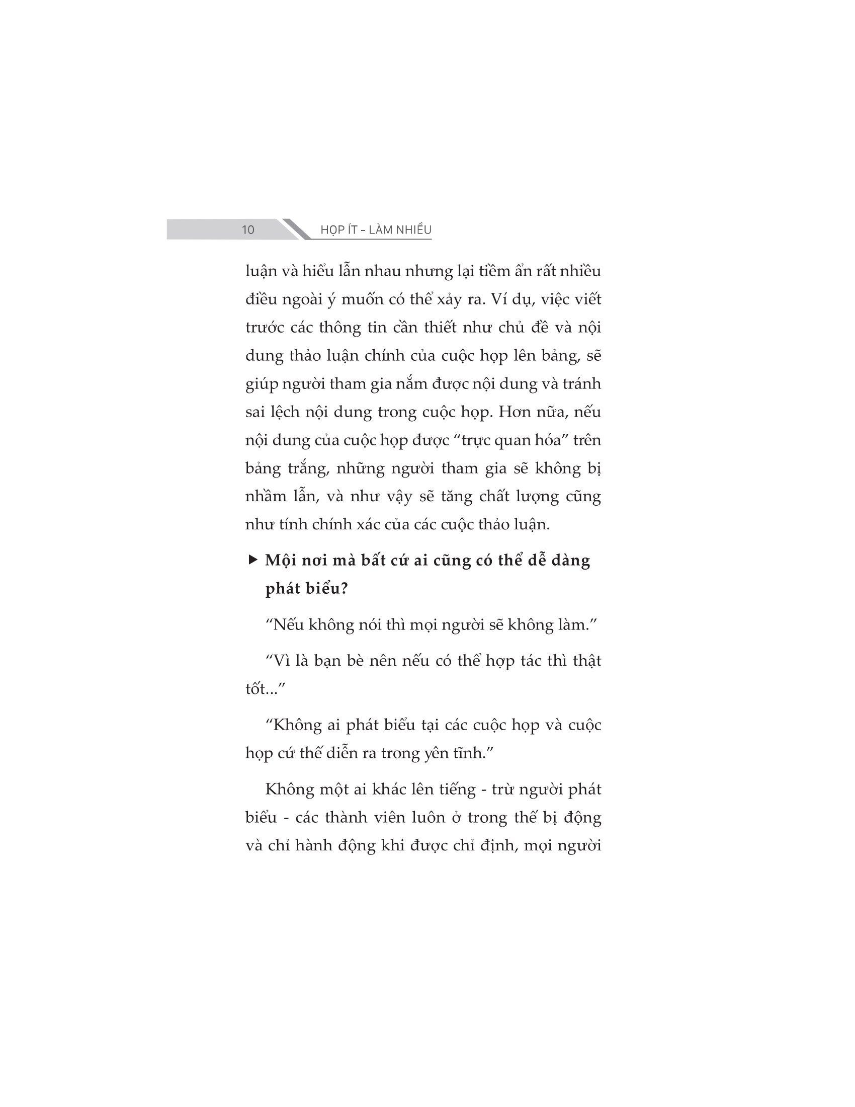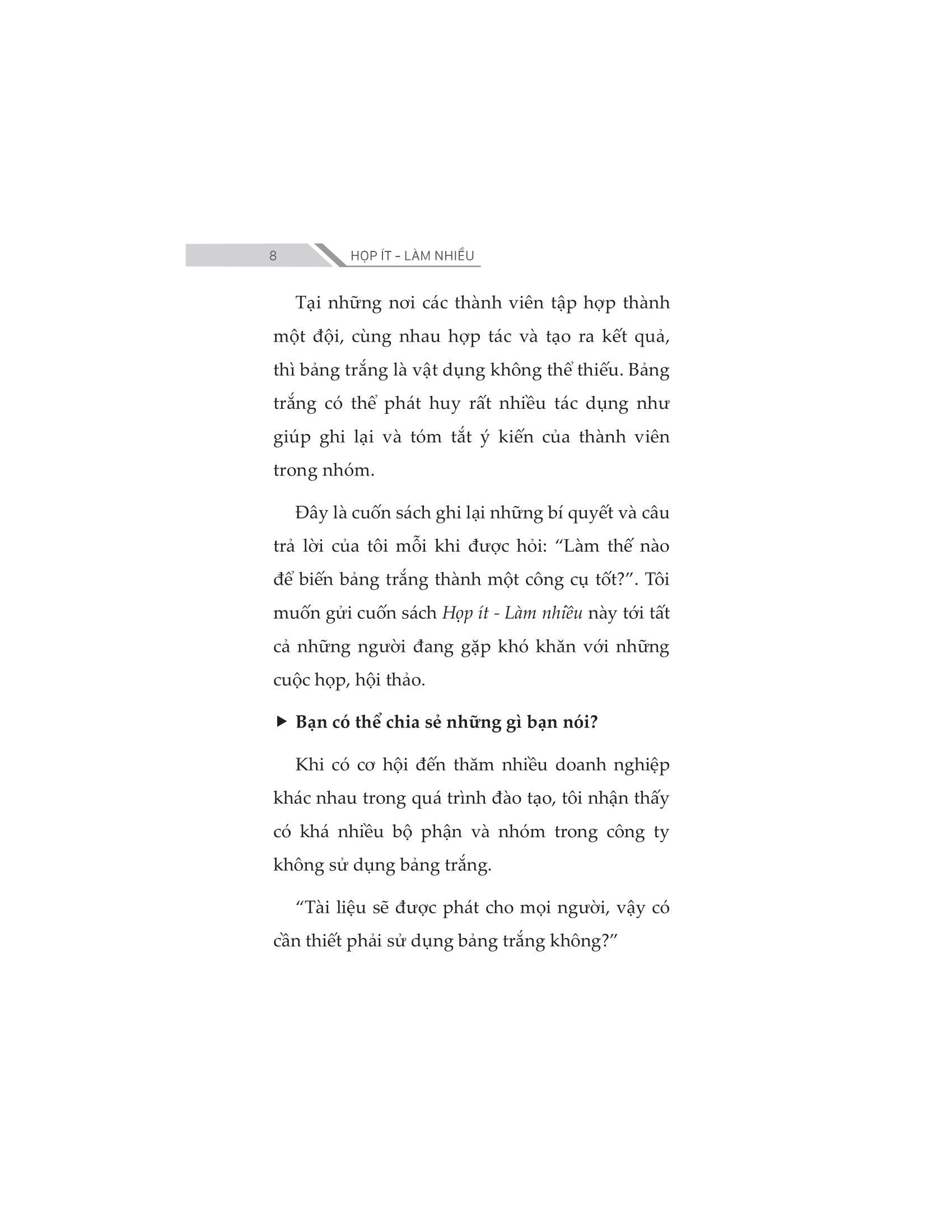 - Chờ đợi các thành viên tham gia cuộc họp, đến giờ họp nhưng còn thiếu thành viên… Để một cuộc họp diễn ra suôn sẻ và hiệu quả không quá khó. Vấn đề nằm ở vai trò của người điều hành và thái độ của các thành viên tham gia. Đã đến lúc bạn không lãng phí thời gian của m.ình vào những buổi họp nhàm chán và phát huy vai trò hiệu quả của các buổi họp. Cuốn sách HỌP ÍT - LÀM NHIỀU là một tài liệu hữu ích dành cho những người muốn tìm hiểu về cách tổ chức các cuộc họp hiệu quả và chuyên nghiệp hơn, nhằm giảm thiểu số lượng, cũng như rút ngắn thời gian của các cuộc họp và nâng cao hiệu quả công việc.