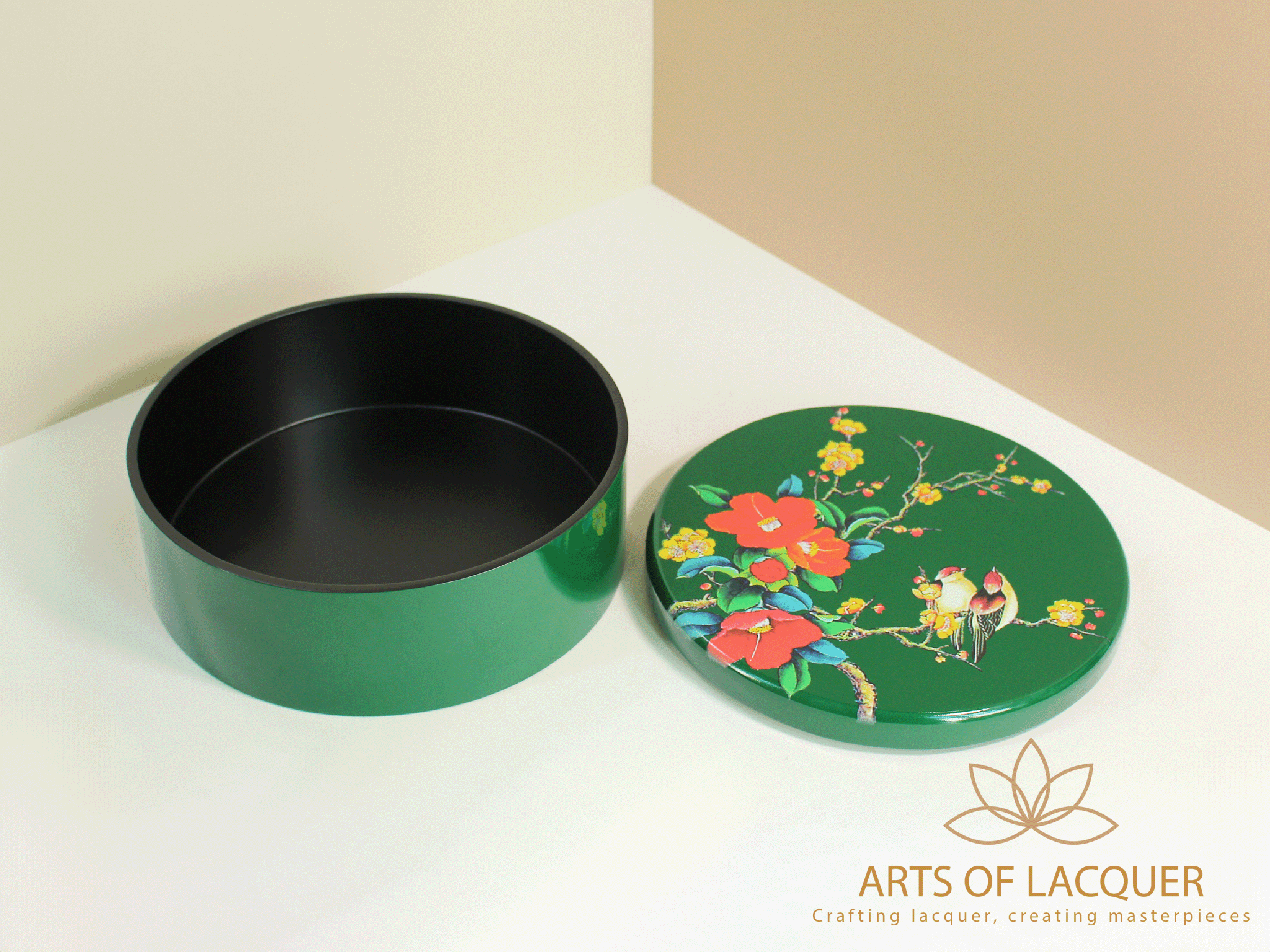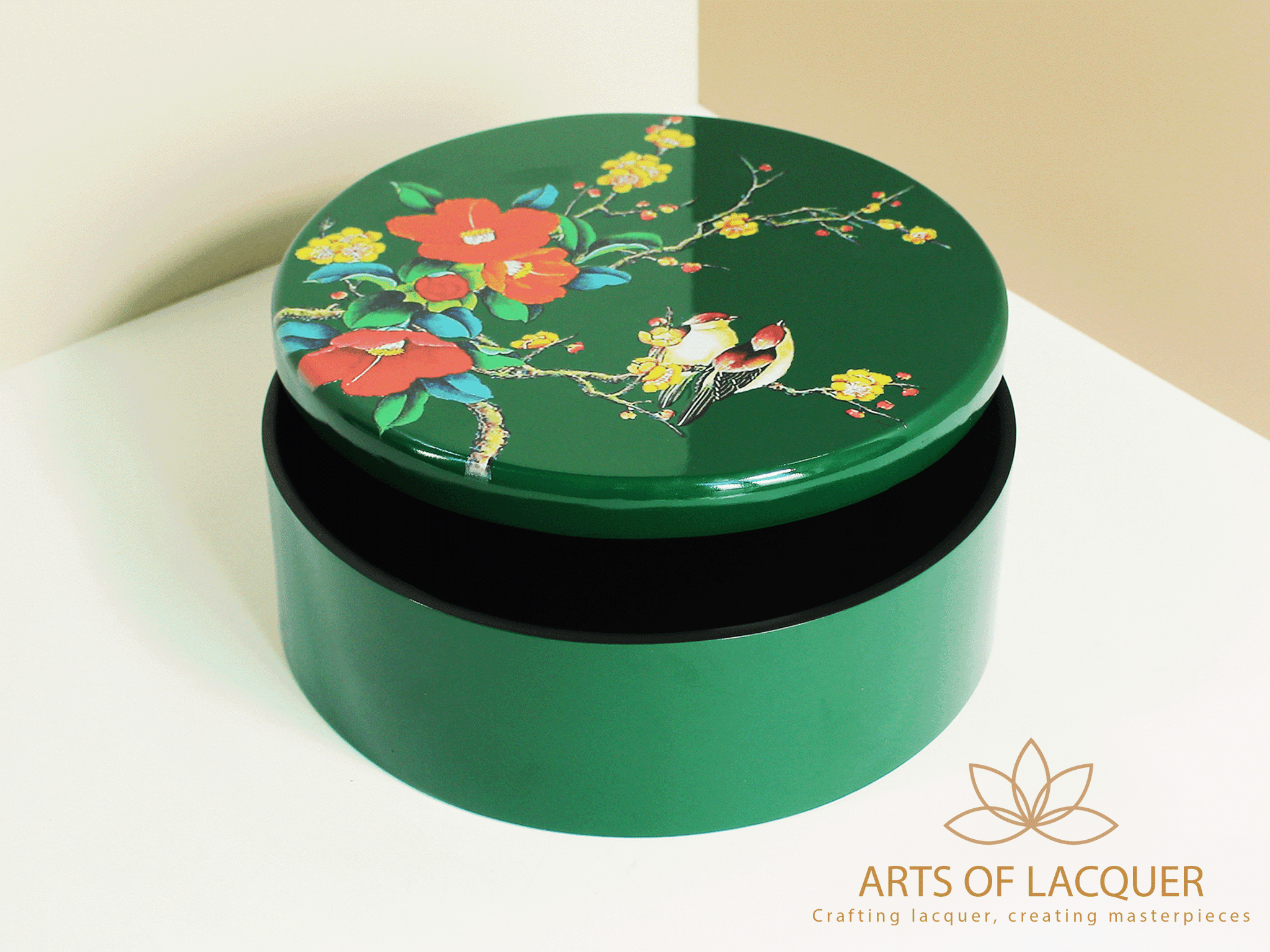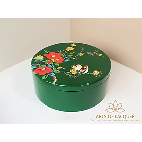 Hộp tròn đựng trong hình là "Hộp Tròn Sơn Mài Họa Tiết Chim Hoa Xanh Đậm" từ Arts of Lacquer. Hộp có thiết kế tròn với nền màu xanh lá cây đậm, được trang trí