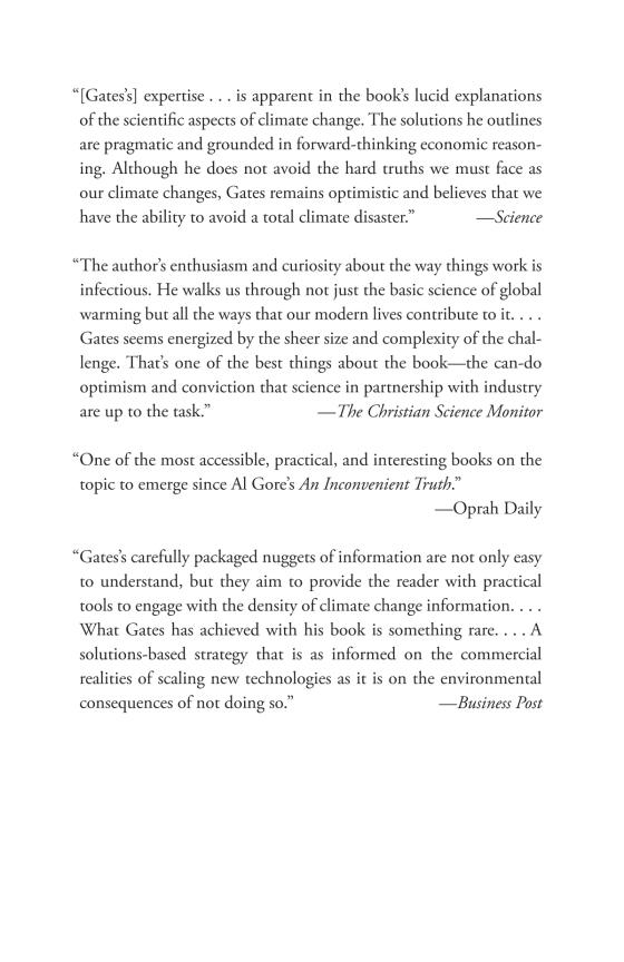 Bill Gates has spent a decade investigating the causes and effects of climate change. With the help of experts in the fields of physics, chemistry, biology, engineering, political science, and finance, he has focused on what must be done in to stop the planet's slide toward certain environmental disaster. In this book, he not only explains why we need to work toward net-zero emissions of greenhouse gases, but also details what we need to do to achieve this profoundly important goal.