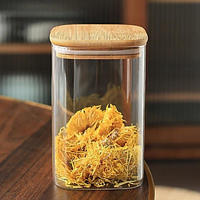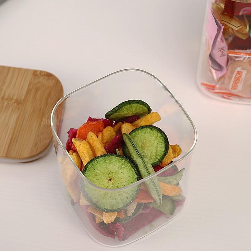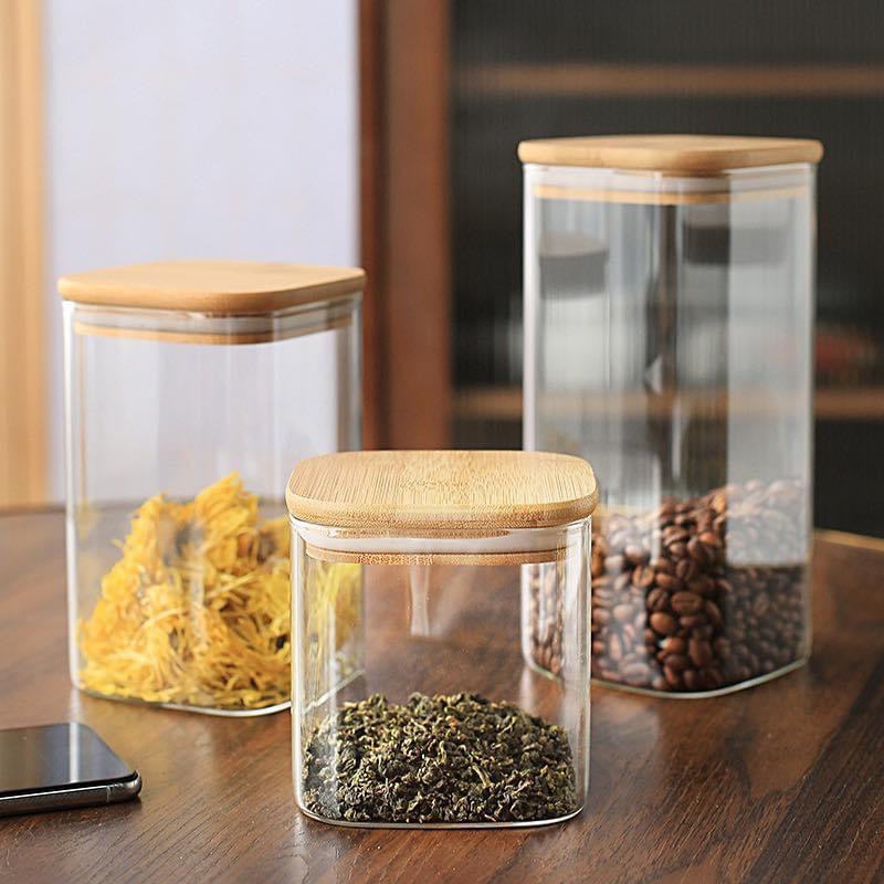 Hũ thuỷ tinh nắp gỗ dáng vuông độc đáo để đựng các loại hạt, đồ khô hay bánh kẹo, mì khô vừa đẹp, lại sạch sẽ, gọn gàng Hũ có nắp gỗ có gioăng silicone