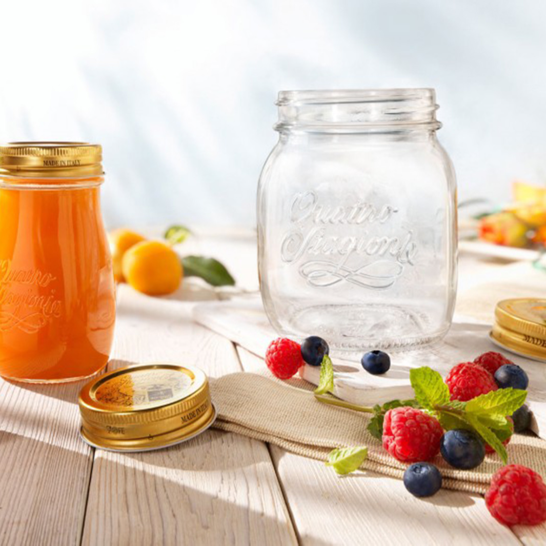 Nắp đậy màu vàng đồng nổi bật có in logo thiết kế dạng xoay giúp đậy kín và cách ly thực phẩm khỏi bụi bẩn. Phần thân chai cách điệu với logo Quattro Stagioni in nổi vừa đẹp mắt vừa có công dụng chống trơn trượt và làm nổi bật sự tinh tế của chất liệu thủy tinh.