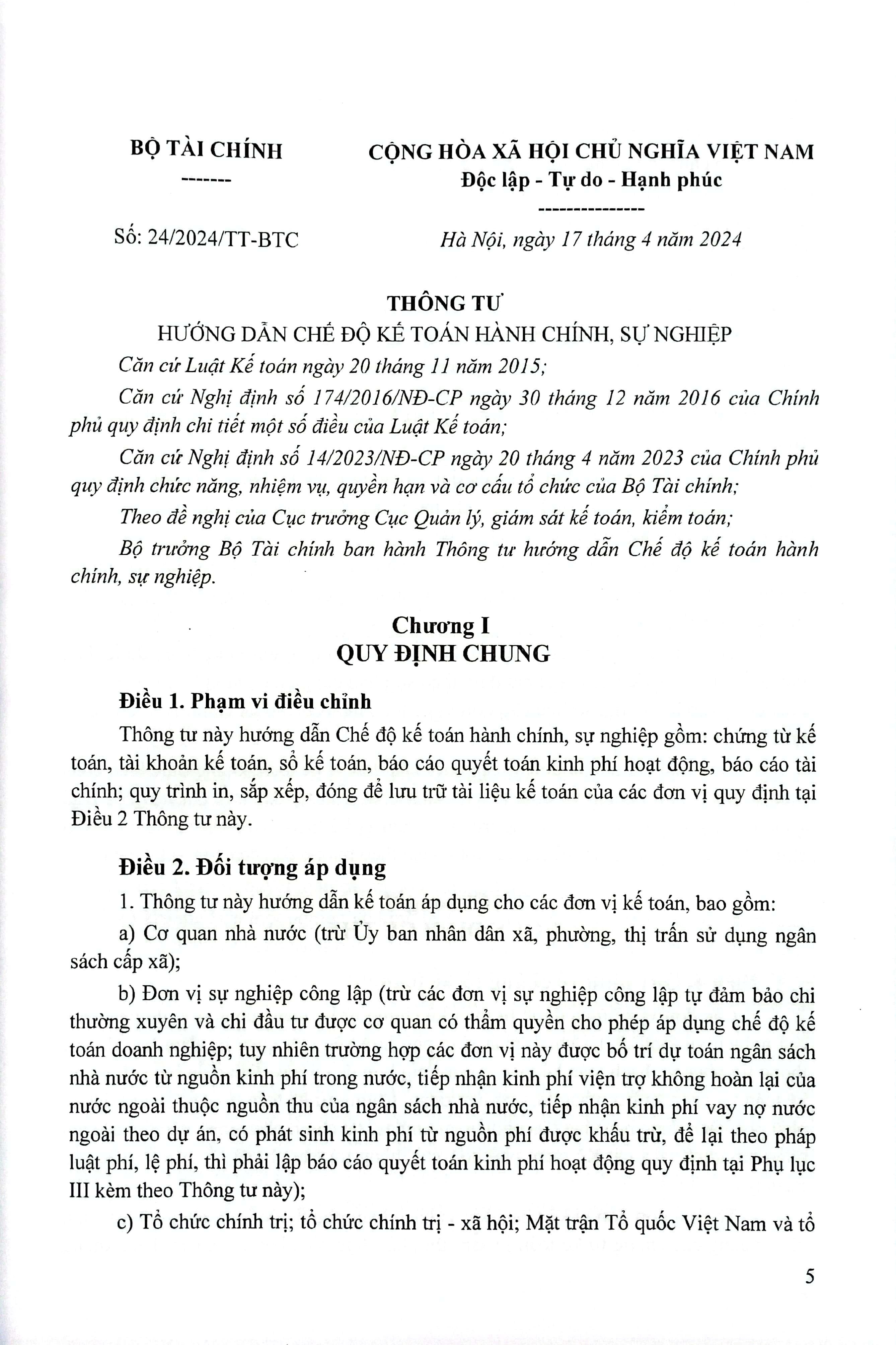 Ngày 17 tháng 4 năm 2024, Bộ Tài chính ban hành Thông tư số 24/2024/TT-BTC hướng dẫn Chế độ kế toán hành chính, sự nghiệp gồm: chứng từ kế toán, tài khoản kế toán, sổ kế toán, báo cáo quyết toán kinh phí hoạt động, báo cáo tài chính; quy trình in, sắp xếp, đóng để lưu trữ tài liệu kế toán của các đơn vị. Đối tượng được áp dụng cho các đơn vị kế toán, bao gồm: Cơ quan nhà nước (trừ Ủy ban nhân dân xã, phường, thị trấn sử dụng ngân sách cấp xã); Đơn vị sự nghiệp công lập; Tổ chức chính trị; tổ chức chính trị – xã hội; Mặt trận Tổ quốc Việt Nam và tổ chức, cơ quan, đơn vị khác là đơn vị sử dụng ngân sách nhà nước; Tổ chức, cơ quan, đơn vị thực hiện cơ chế tài chính của đơn vị sự nghiệp công lập.