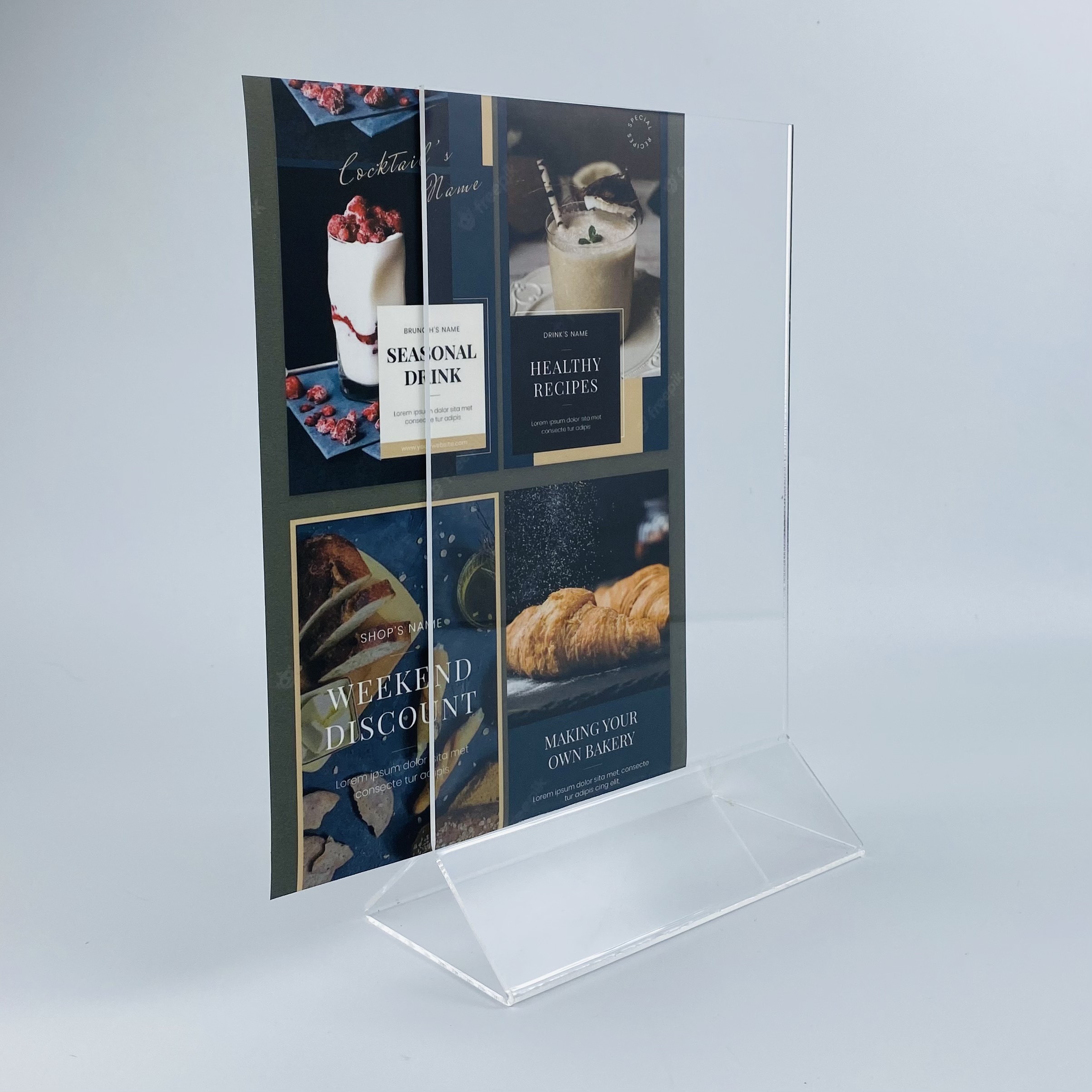 Kệ mica 2 mặt Enter để bàn là sản phẩm làm từ Mica Đài Loan, có công dụng trưng bày thực đơn, hiển thị giá cả sản phẩm tại các nhà hàng, khách sạn... sản phẩm này còn được dùng như một standee để bàn quảng cáo sản phẩm một cách ấn tượng nhất.