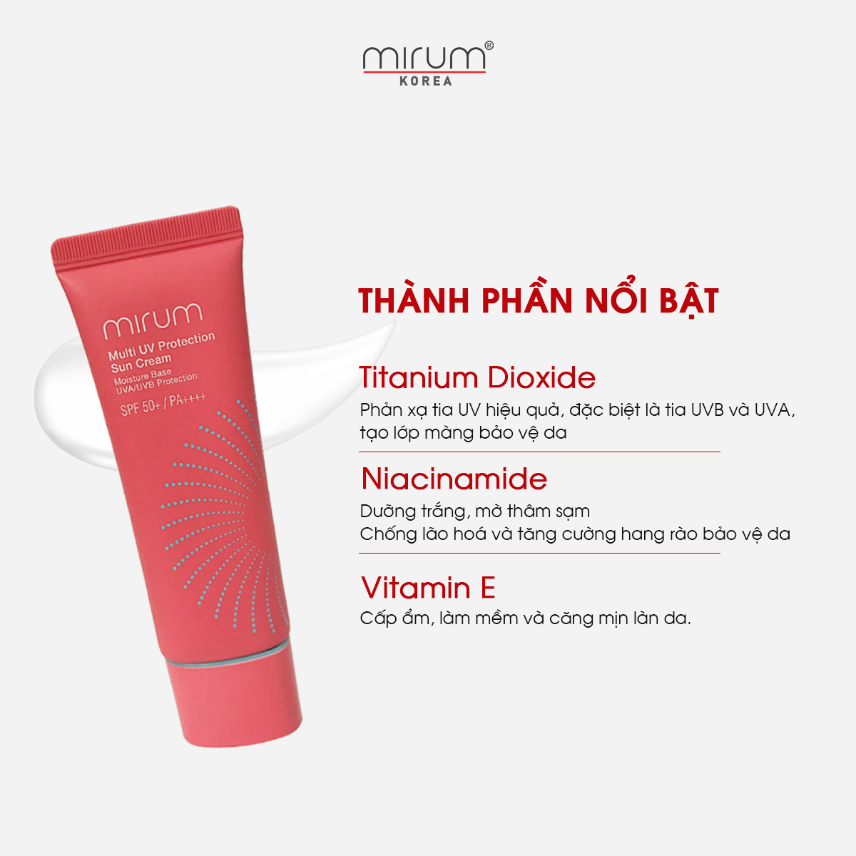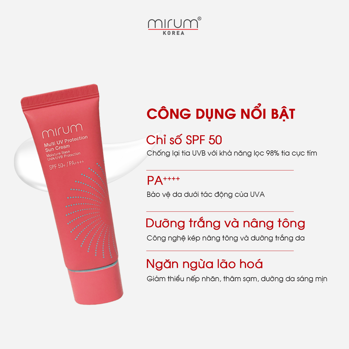 Mua tại TiktokKem chống nắng nâng tông, dưỡng trắng, ngừa lão hóa và bảo vệ da toàn diện Mirum 50ml – Mirum Multi UV Protection Sun Cream SPF 50+/PA+++ THÔNG TIN SẢN PHẨM Kem chống nắng nâng tông, dưỡng trắng, ngừa lão hoá và bảo vệ da toàn diện Mirum 50ml