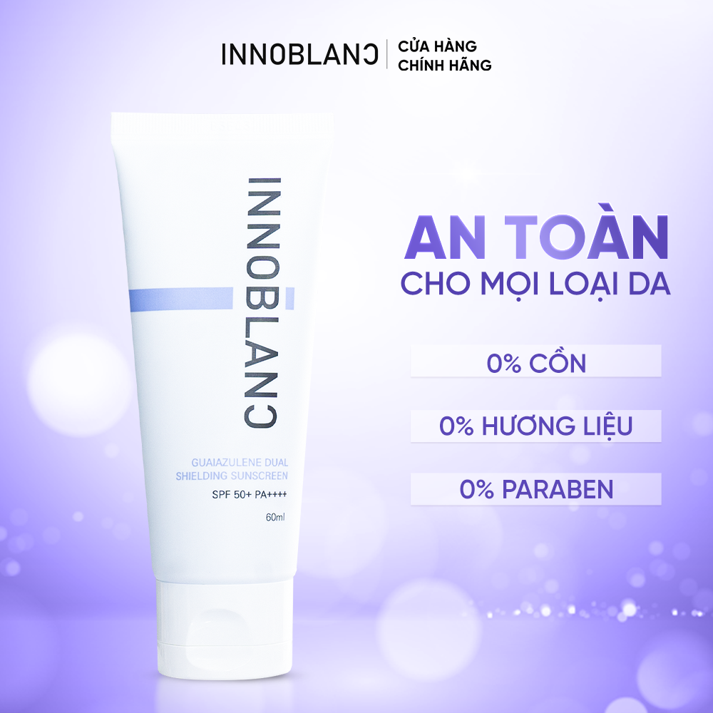 Mua tại TiktokMÔ TẢ SẢN PHẨM: Innoblanc – Guaiazulene Dual Shielding Sunscreen là kem chống nắng kết hợp giữa màng lọc vật lý và hóa học, giúp bảo vệ da toàn diện khỏi tác động của tia UVA & UVB, đồng thời nuôi dưỡng và chăm sóc làn da với chiết xuất thiên nhiên và các hoạt chất dưỡng ẩm, chống oxy hóa. Kết cấu mỏng nhẹ, dễ tán, không để lại vệt trắng hay nhờn rít – phù hợp với khí hậu nóng ẩm và mọi loại da. CÔNG DỤNG: