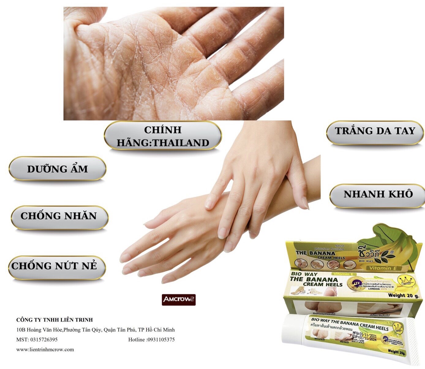 và gót chân BIO WAY THE BANANA CREAM HELLS 20g- Thailand Thành phần: Water,carbomer,mineral oil Cetyl alcohol,ceteareth-20,stearyl alcohol Triethanolamine,petrolatum,tocopheryl acetate Musa paradisiaca fruit extract,petrolatum, Methyl paraben Sản