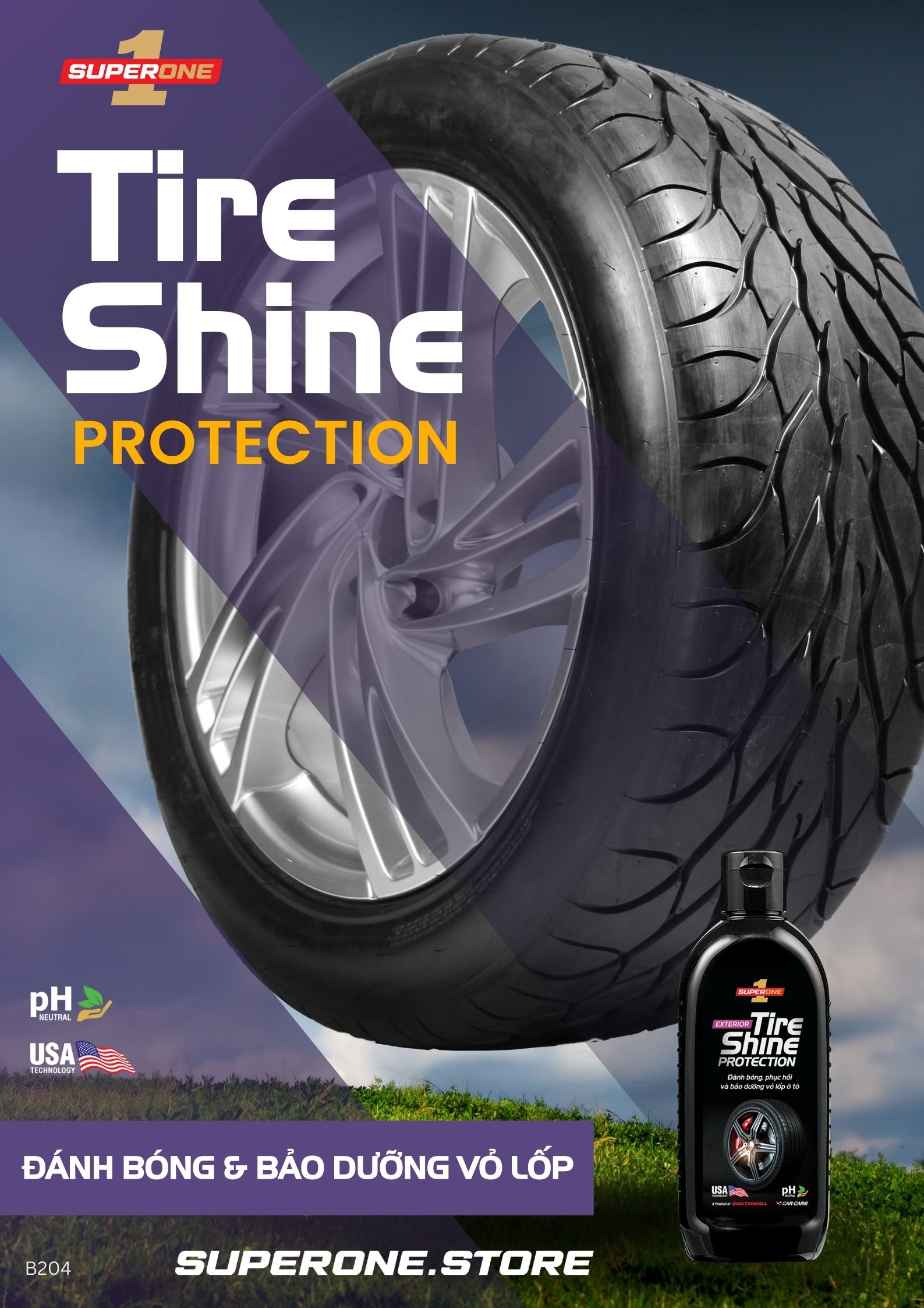 Kem Đánh Bóng Bảo Dưỡng Vỏ Lốp Ô Tô Super One Tire Shine Protection - Exterior là sản phẩm chăm sóc ô tô giúp làm mới, bảo vệ và giữ cho vỏ lốp ô tô luôn sáng bóng như mới. Với công thức tiên tiến, sản phẩm giúp tái tạo lại độ đen bóng như mới cho bề mặt vỏ lốp ô tô, ngăn ngừa sự lão hóa cao su do tác động của tia UV và nhiệt độ cao, bổ sung lớp phủ bảo dưỡng cho độ bóng tự nhiên, chống bám bẩn lốp xe, không làm ố hoặc tạo mảng bám trên bề mặt và có độ bền lớp dưỡng lâu dài. Sản phẩm chuyên dụng được khuyến cáo sử dụng cho các loại lốp ô tô. Kem Đánh Bóng Bảo Dưỡng Vỏ Lốp Ô Tô Super One Tire Shine Protection - Exterior là lựa chọn hoàn hảo để giúp chiếc xe của bạn luôn tỏa sáng, sang trọng và đẳng cấp.