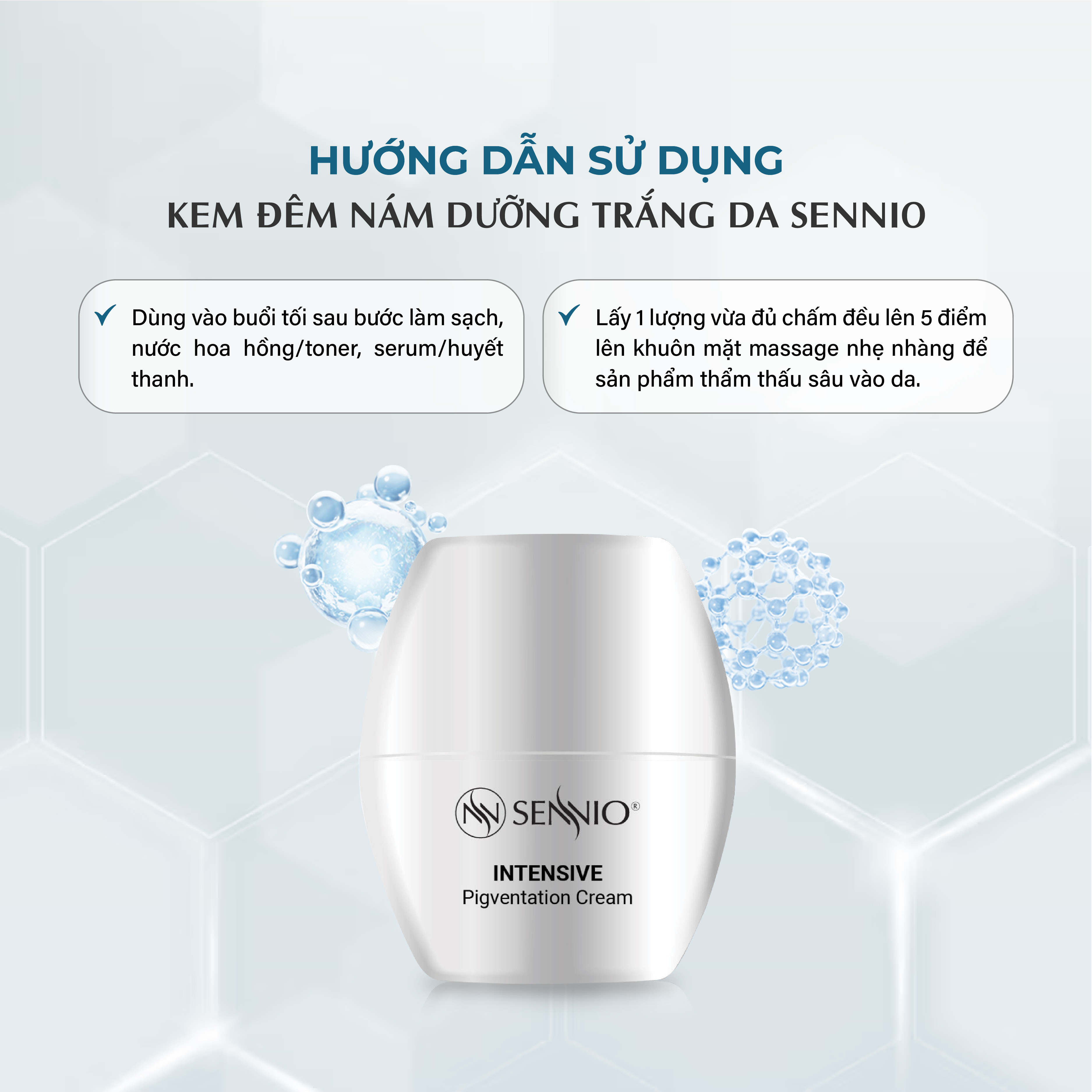 - An toàn, lành tính với mọi làn da, kể cả da mụn, da yếu, da nhạy cảm HƯỚNG DẪN SỬ DỤNG KEM DƯỠNG ẨM DƯỠNG TRẮNG DA XÓA MỜ SẠM NÁM BAN ĐÊM SENNIO: