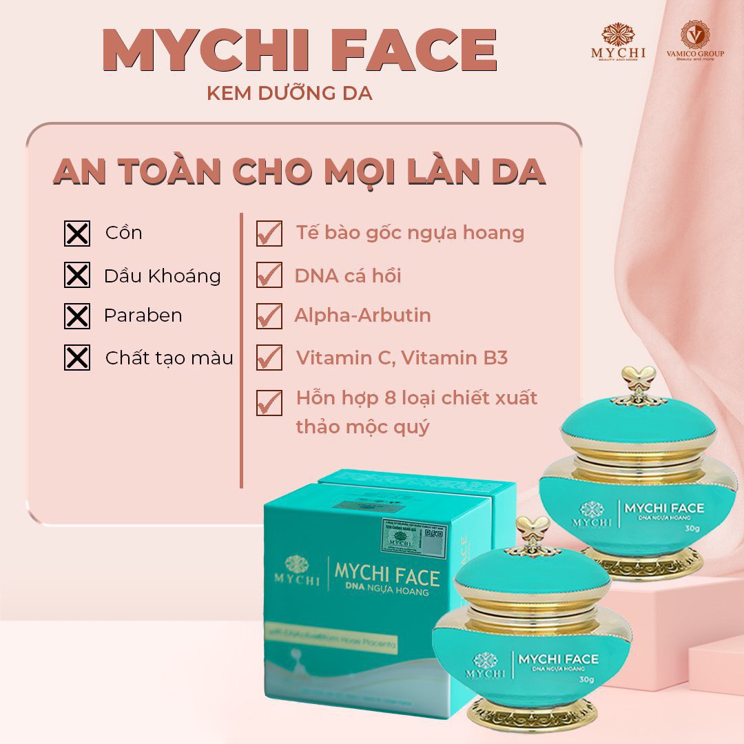 - CÔNG DỤNG Chắc trong chị em đây không ai là không muốn bảo vệ da mặt của mình nhỉ. Bài hôm trước chúng ta đã biết về kem chống nắng của MyChi. Hôm nay Mỹ Phẩm MyChi cho ra mắt bộ sản phẩm Kem Face MyChi để giúp da mặt của mình được bảo vệ 1 cách tuyệt đối – Làm trắng da và đều màu da, cấp ẩm cho da. – Tăng độ đàn hồi cho da, tăng cường sản sinh collagen giúp da căng mướt hồng hào tự nhiên – Hỗ trợ ngừa nám, phá huỷ sắc tố melanin gây nám da. làm sáng và dịu da. Có khả năng thẩm thấu sâu ( thẩm thấu đa tầng) vào da giúp làm sáng da đối với các tổn thương do ánh nắng mặt trời có thể nhìn thấy, đốm đồi mồi hoặc sẹo và từ đó cải thiện khả năng chống lão hóa trên da. – Cải thiện sắc tố da tại các điểm bị tổn thương vì sẹo mụn, dưỡng sáng da từ từ nhẹ nhàng hơn, thích hợp với làn da nhạy cảm và kể cả da nhiễm corticoid
