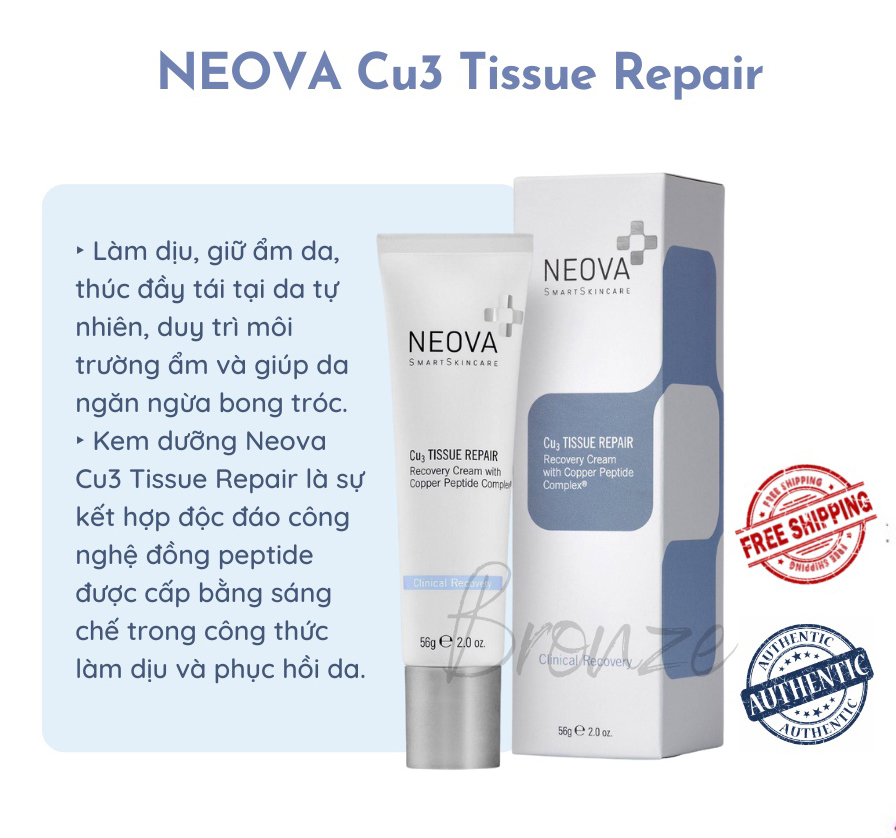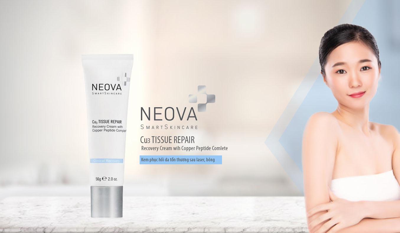 là dòng kem siêu phục hồi da tổn thương sau laser, lăn kim… Sản phẩm có khả năng thúc đẩy quá trình tái tạo da tự nhiên sau điều t rị thẩm mỹ. Giúp hết ngứa, làm dịu da và làm lành vết thương nhanh. Đồng thời duy trì độ ẩm tối đa cho da và hồi sinh da khỏe mạnh, tươi mới. Kem phục hồi da tổn thương sau laser, lăn kim Neova Cu3 Tissue Repair. Làn da mỏng yếu, bị tổn thương sau điều t rị thẩm mỹ cần được chăm sóc bởi kem dưỡng phục hồi Neova Cu3 Tissue Repair Với thời đại công nghệ ngày càng phát triển mạnh mẽ, phái đẹp ưa chuộng hơn cách làm đẹp bằng công nghệ như laser, lăn kim… Nhưng sau khi áp dụng các phương pháp này, làn da sẽ đối mặt với những rủi ro nếu bạn không có cách chăm sóc và bảo vệ da tốt nhất. Bởi lúc này, da rất mỏng yếu, bị ngứa rát, sưng đỏ và dễ bị kích ứng. Làn da sau điều t rị lăn kim, laser…mỏng yếu, dễ kích ứng. Thấu hiểu nhu cầu của khách hàng, hãng  – Mỹ đã nghiên cứu và cho ra đời dòng Neova Cu3 Tissue Repair. Đây là dòng kem dưỡng siêu phục hồi da tổn thương sau laser, bỏng hay lăn kim đã nhận được sự đánh giá tích cực từ các chuyên gia cũng như những khách hàng đã sử dụng qua. Hiệu quả vượt trội nhất của kem phục hồi da tổn thương Neova Cu3 Tissue Repair là khả năng làm dịu da, căng da, ngứa rát. Hết nhanh tình trạng bong vảy, đóng vảy trên da. Tích cực phục hồi nhanh chóng những tổn thương trên da. Tăng cường các dưỡng chất, duy trì độ ẩm tối đa để tái tạo da tốt nhất và đưa làn da trở về trạng thái mềm mại, tươi tắn và khỏe mạnh như ban đầu. Neova Cu3 Tissue Repair là “giải pháp” tốt nhất để chăm sóc và phục hồi da sau tổn thương. Đây là những đối tượng đặc biệt thích hợp để sử kem phục hồi da tổn thương Neova Cu3 Tissue Repair
