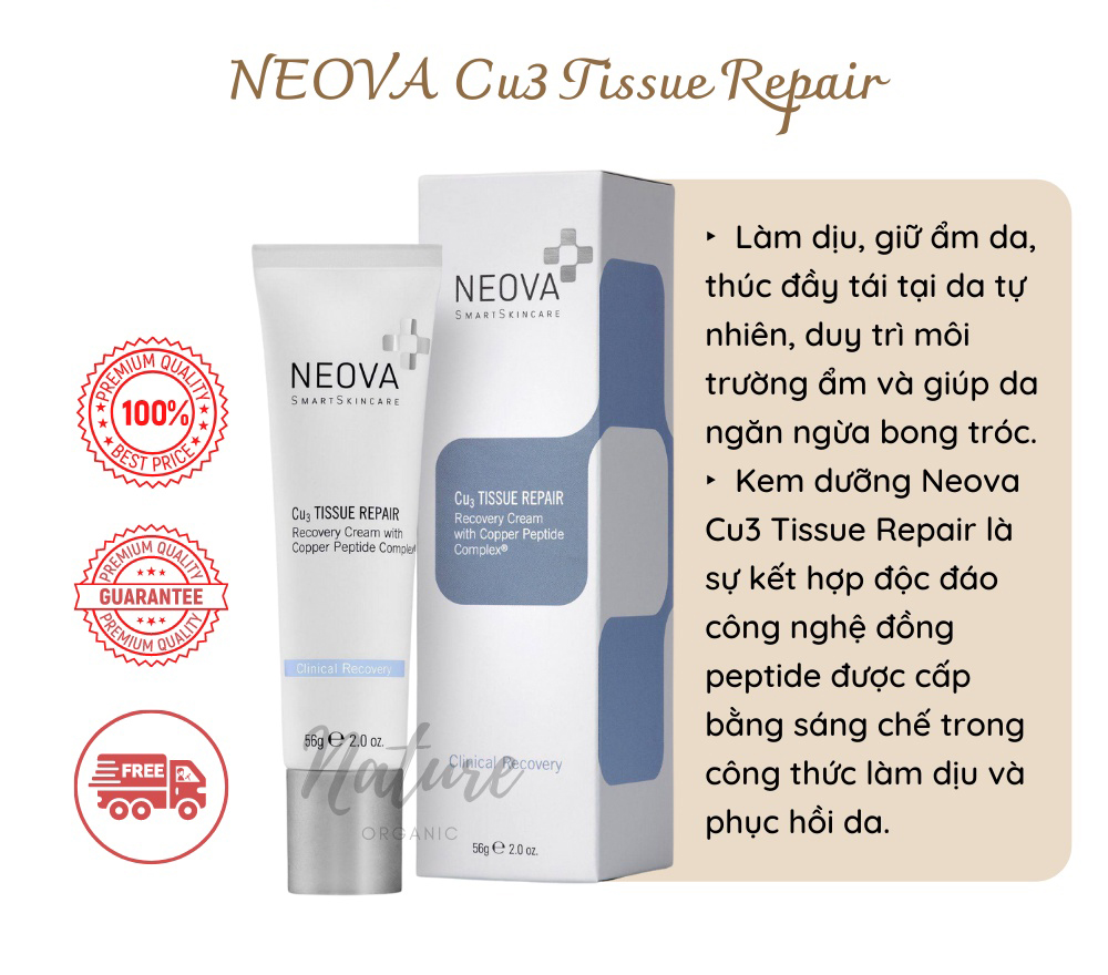 • Đậy nắp kĩ sau khi sử dụng. Đừng để làn da gặp phải những rủi ro không mong muốn sau khi điều t rị thẩm mỹ như lăn kim, laser…Tậu ngay kem phục hồi da tổn thương Neova Cu3 Tissue Repair để tái tạo da khỏe mạnh, tươi tắn nhanh chóng. Đặc biệt là khắc phục tối đa tình trạng da bong vảy, da căng hay ngứa rát THÔNG TIN SẢN PHẨM