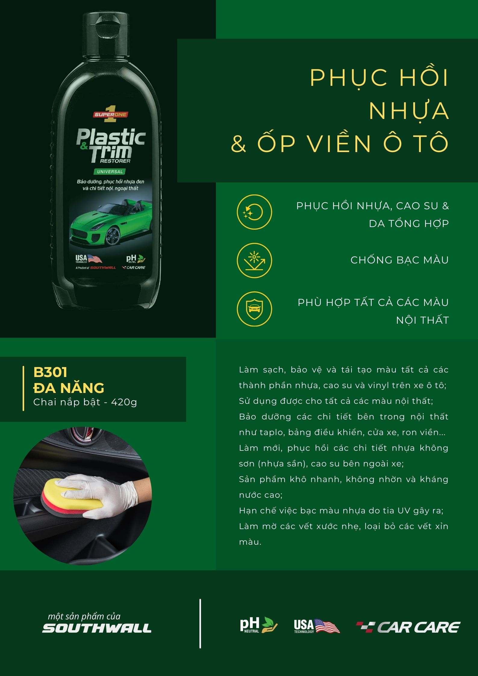 ✨Kem Phục Hồi Nhựa & Ốp Viền Ô Tô SUPERONE Plastic & Trim Restorer - Universal SOUTHWALL B301