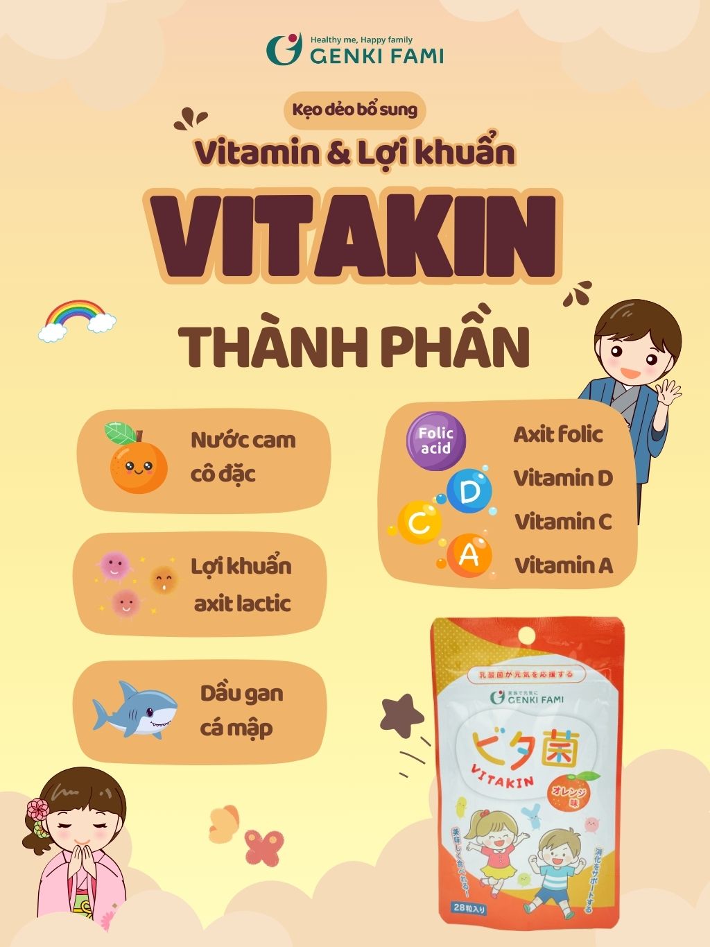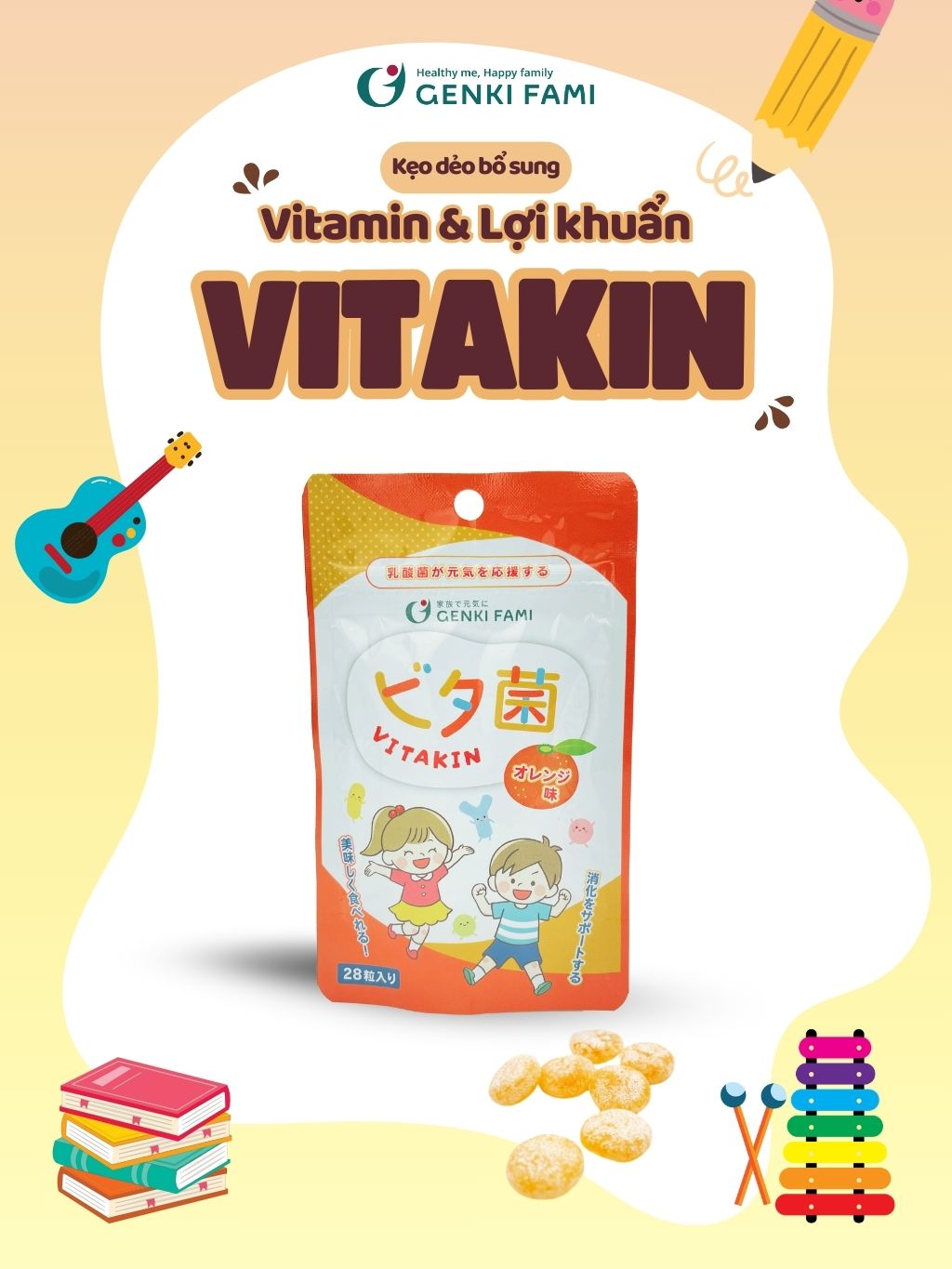 ✨Kẹo Dẻo Vị Cam Bổ Sung Vitamin và Lợi Khuẩn Genki Fami Nhật Bản