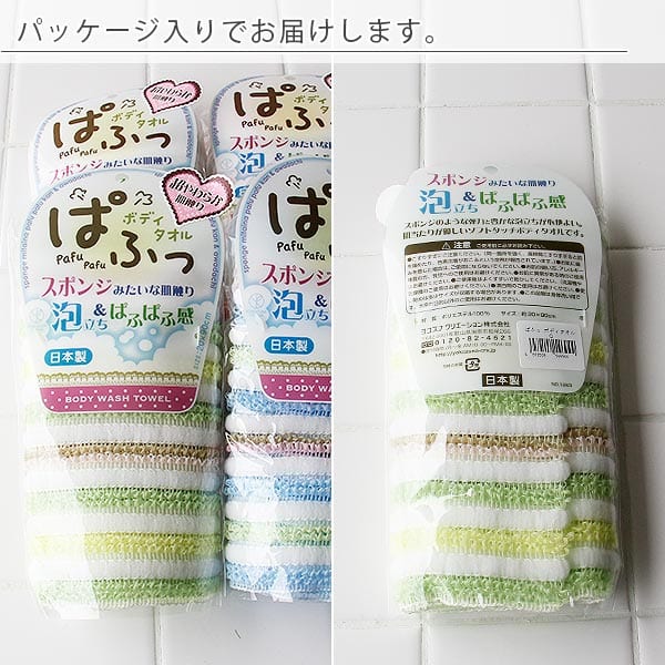 100% Polyester bông xốp với khả năng kháng khuẩn (Ag+) và tạo bọt nhanh chóng không khô rát & gây trầy xước cơ thể, tắm sạch hơn, tiết kiệm nước và xà bông, sữa tắm ■ Công dụng: ● Dùng để kỳ lưng & mát xa cơ thể, giúp tẩy sạch hoàn toàn những tế bào chết ● Nhẹ nhàng làm sạch da đồng thời mang lại cảm giác sảng khoái, dễ chịu khi vệ sinh cơ thể ■ Ưu điểm: ○ Chất liệu sợi siêu cứng kích thích da ở mức độ vừa phải đồng thời loại bỏ bụi bẩn trên da một cách nhanh chóng ○ Kích thước dài 7.9 inches (20cm) x 35.4 inches (90cm), đủ dài giúp cho người sử dụng thuận tiện trong việc tắm rửa thường xuyên ○ Kiểu kết cấu: Medium | Trung bình ○ Một chiếc khăn cho cảm giác bám dính tốt trên da với công thức tạo bọt mịn nhanh chóng tạo cảm giác sảng khoái và dễ chịu khi sử dụng mà không gây đau rát cơ thể ■ Sản phẩm được nhập khẩu trực tiếp từ Nhật Bản ■ Sản xuất tại Nhật Bản | MADE IN JAPAN
