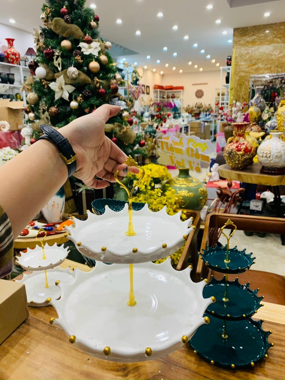 Khay đựng hoa quả bánh kẹo sứ xanh cổ vịt , trắng và thủy tinh trong 3 tầng Những chiếc khay bánh xinh xắn và vô cùng đẹp mắt được làm bằng chất liệu gốm