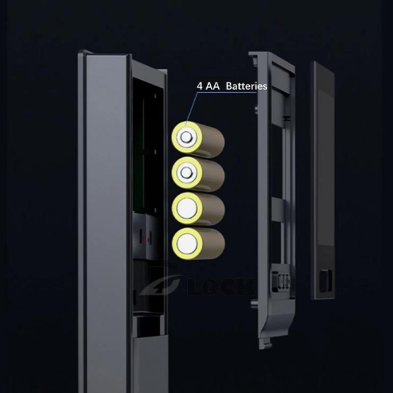 THÔNG SỐ KỸ THUẬT: Kích thước khóa: 80x370mm Nguồn cung cấp: 6V R6.A4 (4 pin AA) Nguồn điện khẩn cấp: 5V-2A, Micro USB Tuổi thọ pin: Mở cửa 3.000 lần Độ dày cửa: 36~90 mm