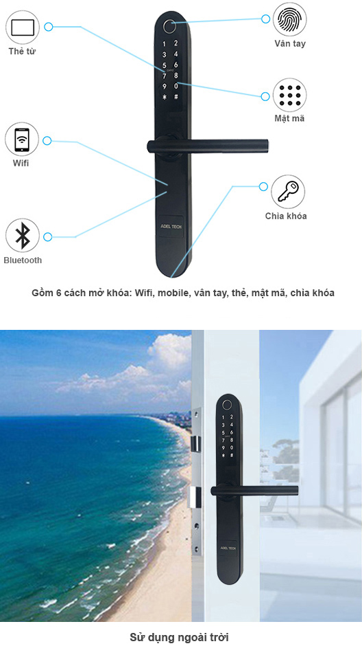 Tính năng sản phẩm 1. Mở khóa từ xa bằng App (Wifi, IR Remote, RE QA code) 2. Mở khóa bằng vân tay 3. Mở khóa bằng thẻ từ 4. Mở khóa bằng mật mã