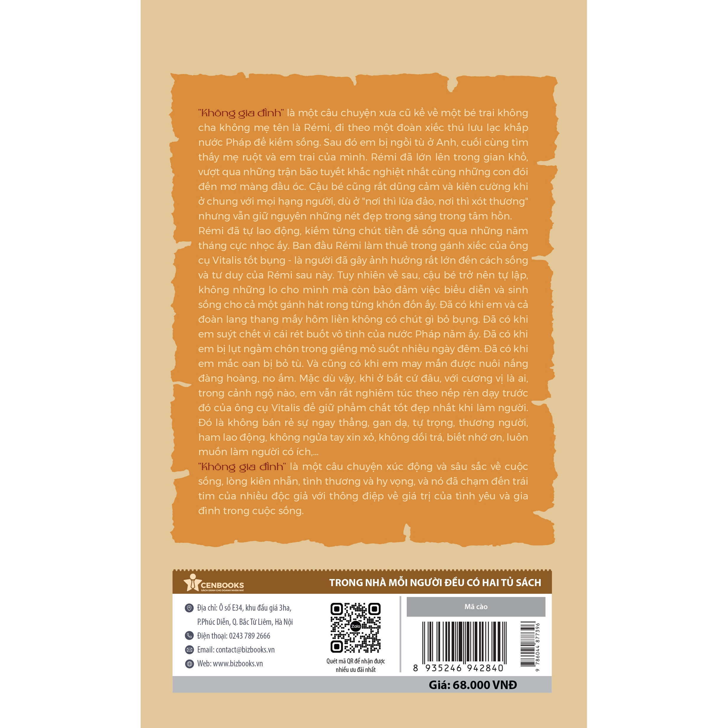 Giới thiệu sách Cuốn sách Không gia đình là hành trình phiêu lưu của Remi, một câu bé mồ côi từ nhỏ. Cái tên Không gia đình gợi lên sự buồn bã, cô đơn, song, khi đọc tác phẩm, ta lại thấy được sự lạc quan, yêu đời trong từng hoàn cảnh, trong mọi tình huống, bên cạnh cậu luôn là những người tốt giúp đỡ. Một tác phẩm đã lấy đi nước mắt nhưng cũng để lại nụ cười cho nhiều độc giả dù là lớn đến bé.