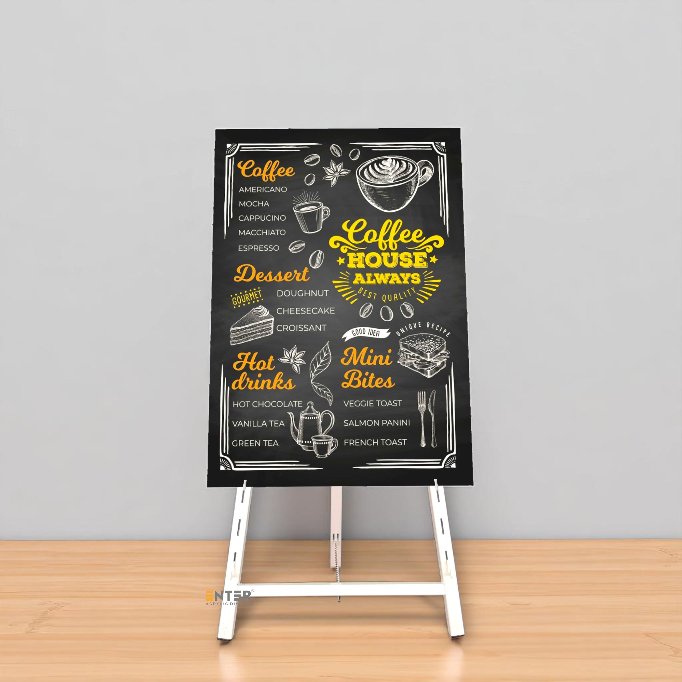Khung vẽ - giá đỡ tranh Enter GV060 được làm bằng kim loại, bề mặt được sơn tĩnh điện với 3 tone màu đen, trắng, vàng đẹp mắt. Khung kệ có độ giày phù hợp giúp kệ có khả năng chịu tải trọng ổn định, bền bỉ.