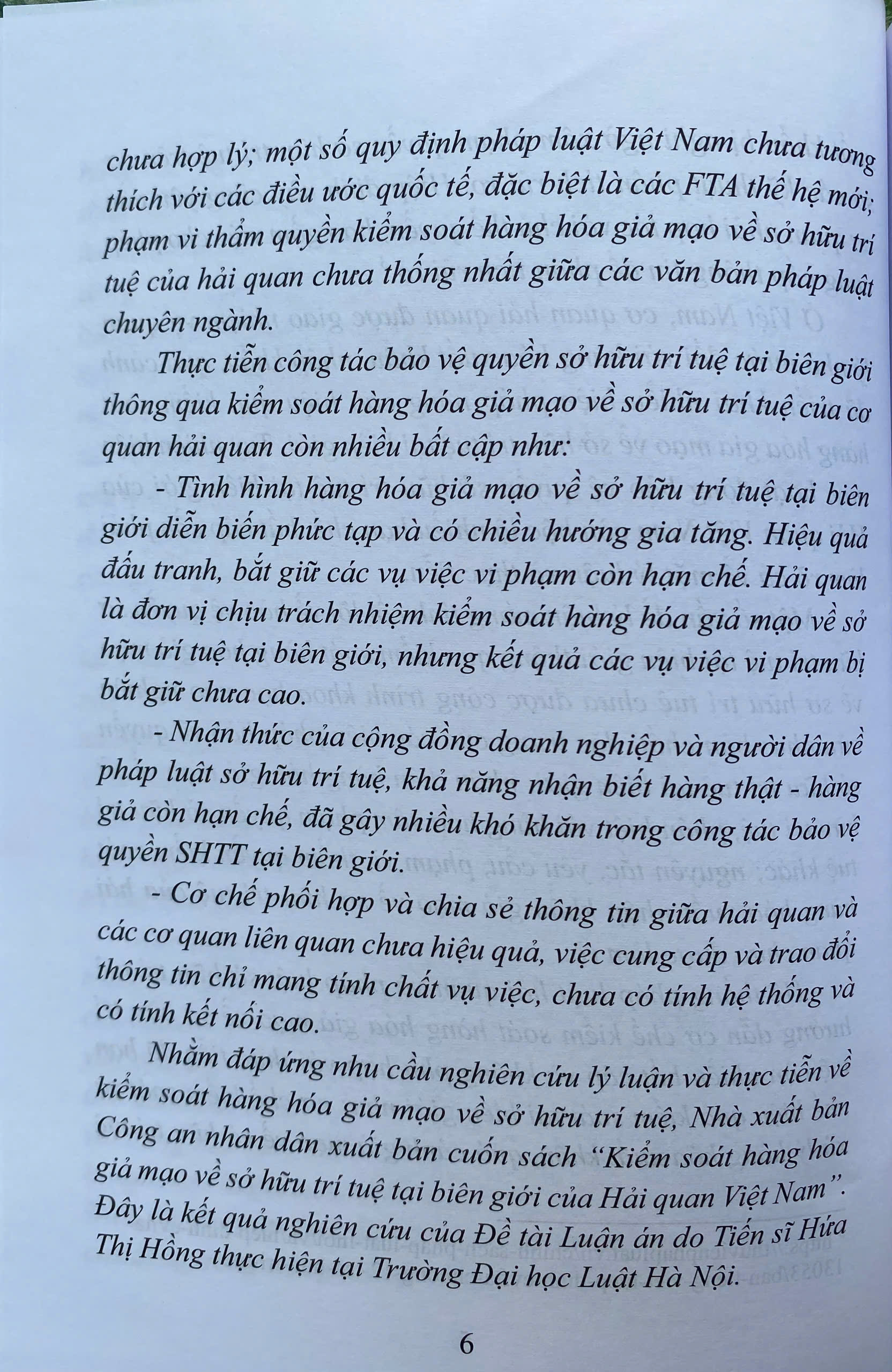 Ở Việt Nam, cơ quan hải quan được giao nhiệm vụ quản lý nhà nước đối với hàng hóa xuất khẩu, nhập khẩu, quá cảnh đã triển khai nhiều biện pháp nâng cao hiệu quả kiểm soát hàng hóa giả mạo về sở hữu trí tuệ tại biên giới. Tuy nhiên hiện nay, hoạt động bảo vệ quyền sở hữu trí tuệ tại biên giới của Hải quan Việt Nam còn bộc lộ nhiều hạn chế, bất cập cần phải làm rõ cả về mặt lý luận và thực tiễn.