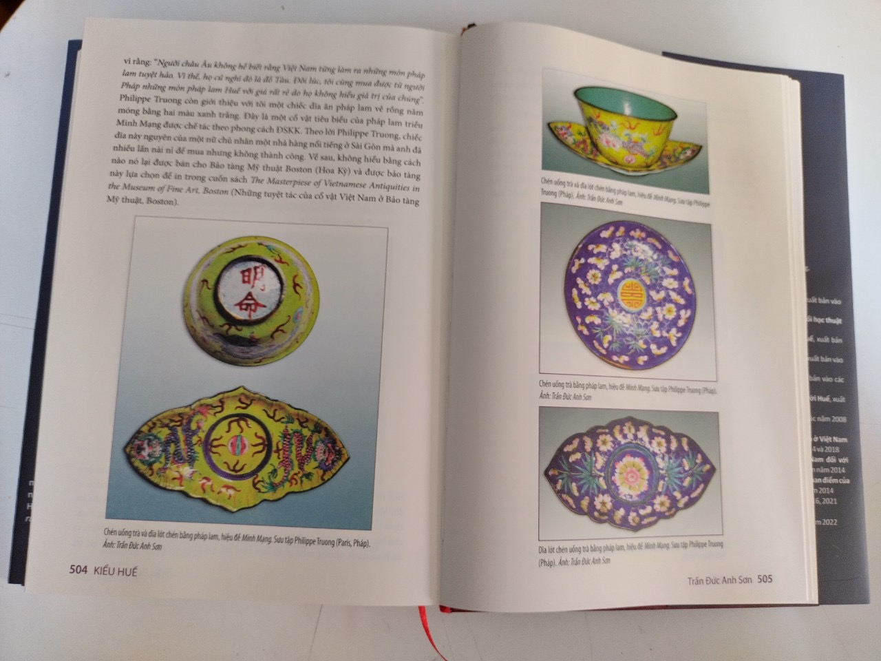 - Phụ lục: Shipouyaki Nhật Bản ở Bruxelles và pháp lam Huế ở Tokyo Ấn triện triều Nguyễn ở di tích Huế Biên chung, biên khánh, bác chung, đặc khánh ở Bảo tàng CVCĐ Huế Đồ ngự dụng xứ Huế Hoành phi câu đối trong ngôi nhà Huế Ngự viên thời Nguyễn và tranh gương cung đình Huế Vũ hội áo dài trên bức trấn phong xưa Tranh tường An Định Cung: nhiều câu hỏi lớn chưa lời đáp! Những bộ đầu hồ xưa Hai bộ xăm hường ở Huế xưa Tranh làng Sình Xe kiệu thời Nguyễn Xem bảo vật hoàng cung triều Nguyễn tại Bảo tàng CVCĐ Huế Cổ vật triều Nguyễn ở nước ngoài (*)