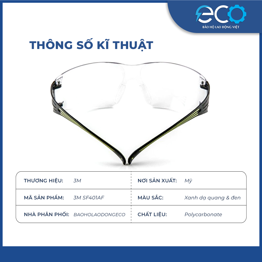 - Gọng kính: Nhựa dẻo siêu nhẹ, ôm sát, kiểu dáng thể thao – Kính bảo hộ 3M SF401AF được áp dụng công nghệ 3M Pressure Diffusion Temple với thiết kế phần gọng có độ đàn hồi cao, ôm khít vào đầu người mang, giảm tình trạng kính bị xê dịch khi đang làm việc. – Phần đệm mũi mềm nên không gây cấn lên phần mũi tiếp xúc. Những kính bảo hộ có phần đệm mũi cứng thường sẽ gây khó chịu cho người sử dụng khi đeo kính trong thời gian dài. – Phần đuôi của gọng kính được phủ lớp vật liệu mềm để tăng cảm giác thoải mái khi sử dụng vì dòng kính bảo hộ SecureFit có gọng kính ôm sát vào đầu người mang. – Tròng kính bằng vật liệu Polycarbonate với nhiều ưu điểm về khả năng chống va đập và chống vỡ vụn cũng như hấp thụ đến 99.9% tia cực tím UVA và UVB. – Khả năng chống va đập của tròng kính đạt tiêu chuẩn ANSI Z87.1-2015. – Model SF401AF có tròng kính được phủ lớp chống đọng sương – một đặc tính rất hữu dụng khi mang kính kèm khẩu trang. Tính năng nổi bật: ️Chống tia UV đến 99.9% – bảo vệ mắt khi lái xe, đi bộ, làm ngoài trời Chống bụi, gió mạnh, mảnh văng nhỏ – lý tưởng cho môi trường công nghiệp & giao thông Chống mờ (anti-fog) – không lo kính mờ khi thở, ra mồ hôi hay thay đổi nhiệt độ Phong cách thể thao cá tính, gọn nhẹ, đeo cực êm – dùng như kính thời trang Tròng trong suốt, không lóa – dễ quan sát, không mỏi mắt khi đeo lâu ️ Ứng dụng thực tế: