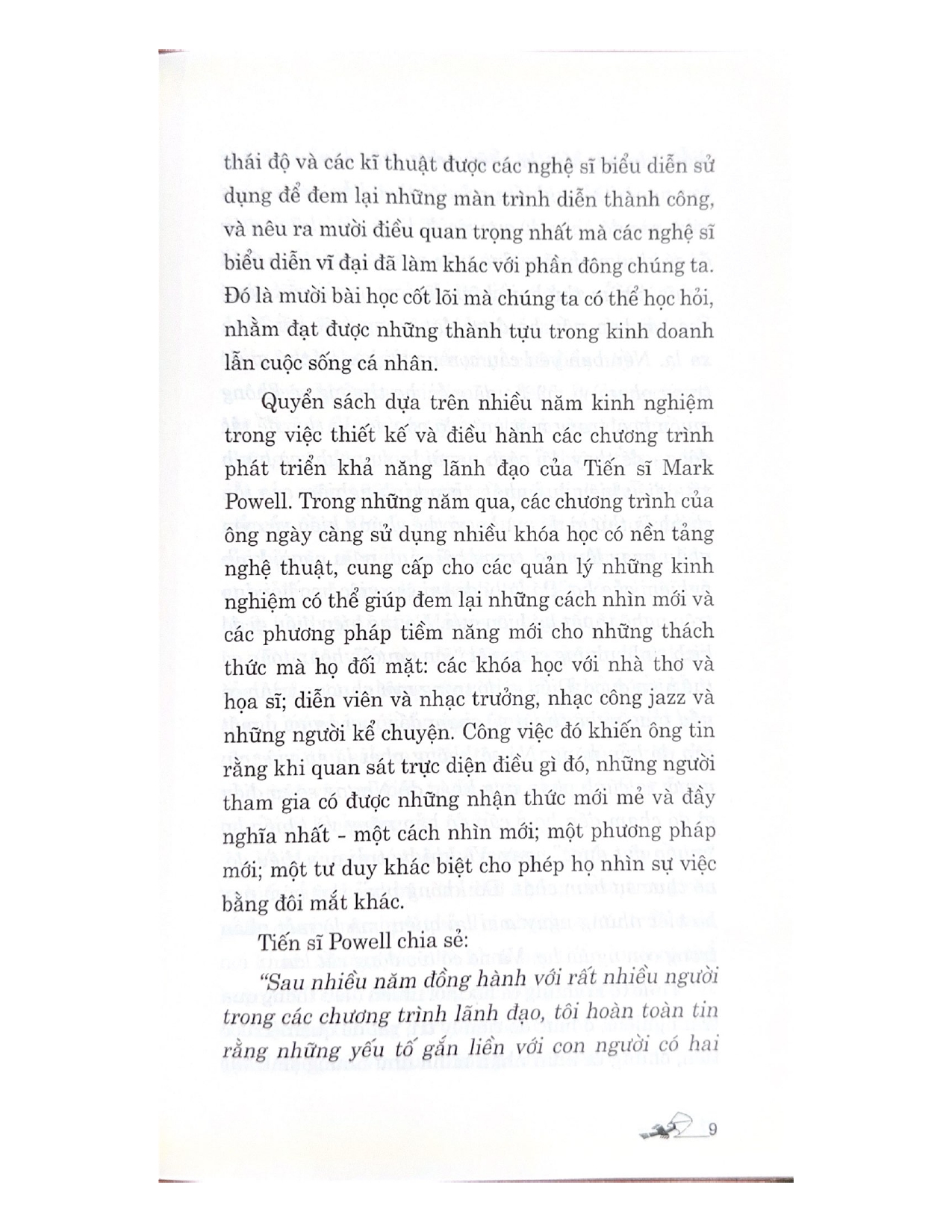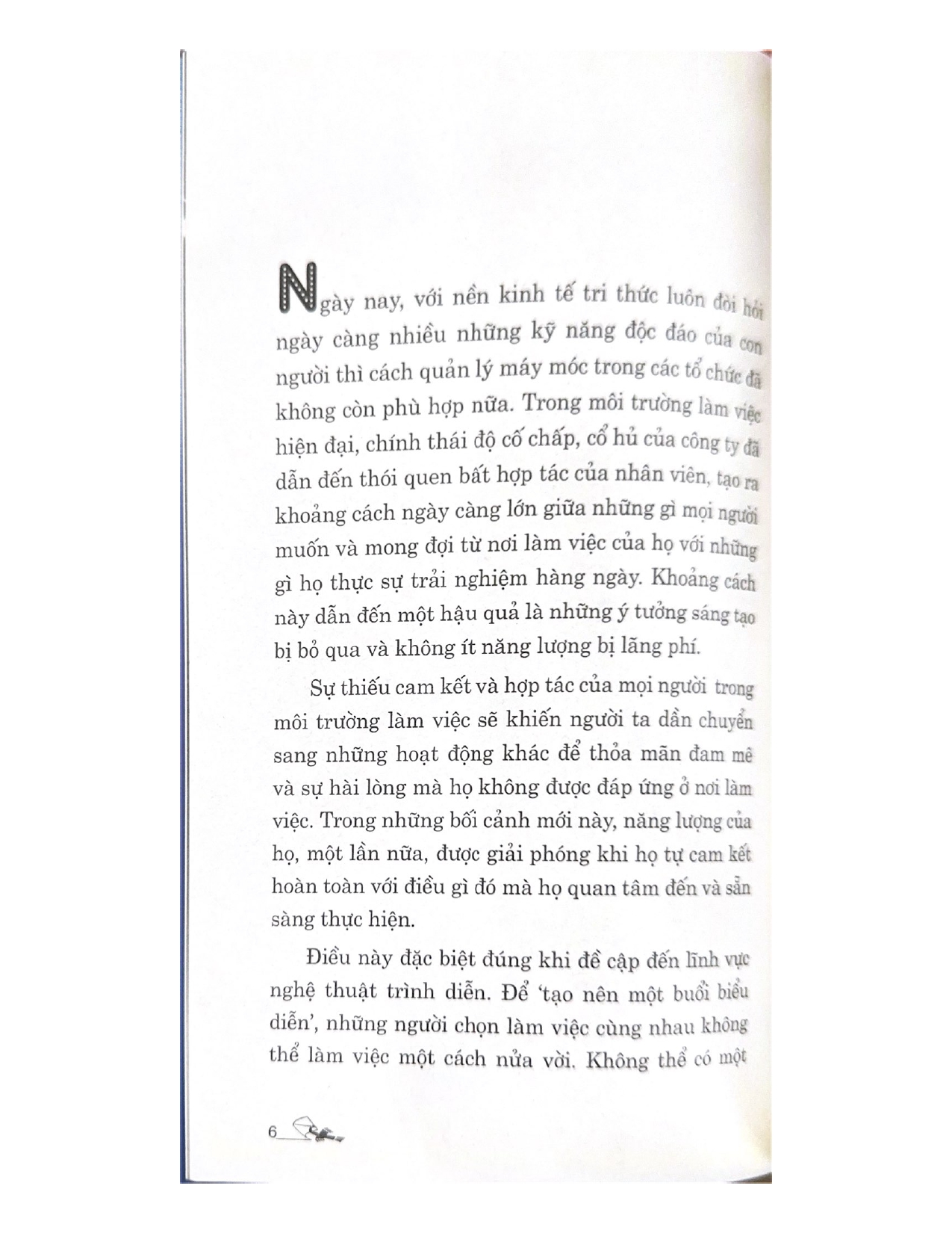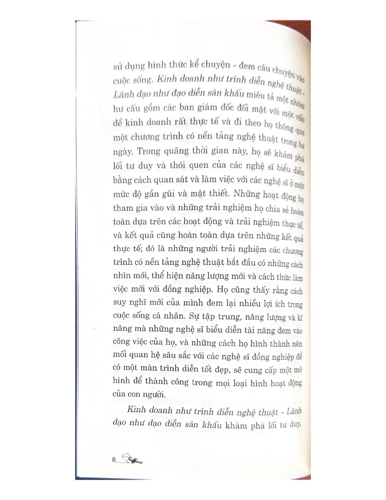 Kinh Doanh Như Trình Diễn Nghệ Thuật, Lãnh Đạo Như Đạo Diễn Sân Khấu là cách tiếp cận mới mẻ trong quản trị kinh doanh với châm ngôn: các tổ chức và các nhà lãnh đạo có thể học hỏi từ nghệ thuật. Mượn hình ảnh các nghệ sĩ biểu diễn các loại hình nghệ thuật khác nhau, tác giả nhấn mạnh một yếu tố không thể thiếu trong quản trị - kỹ thuật truyền cảm hứng, lấy con người làm trung tâm. Ngày nay, thành thạo kỹ thuật và nắm vững chuyên môn thôi chưa đủ để gặt hái được thành công như mong đợi, trong nghệ thuật lẫn trong kinh doanh. Chính vì lý do đó, nếu kinh doanh là một màn trình diễn thì hãy biến nó thành màn trình diễn chói sáng và để lại dấu ấn trong lòng khán giả.
