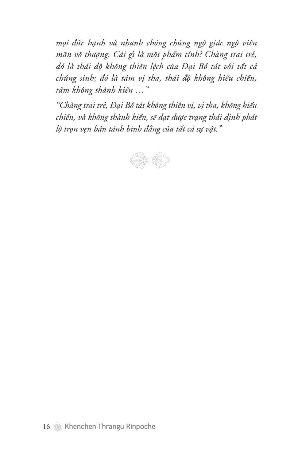 Tác giả: Khenchen Thrangu Rinpoche sinh năm 1933 tại Kham, Tây Tạng. Ngài là giám hộ riêng của Đức Karmapa thứ XVII – Ogyen Trinley Dorje theo chỉ định của Thánh Đức Dalai Lama. Từ 1976, Ngài bắt đầu hoằng pháp tại phương Tây, và đã thành lập nhiều tu viện, ni viện, trường học cho trẻ em Tây Tạng và nhiều phòng khám bệnh. Ngài đã xuất bản 45 cuốn sách về Phật pháp bằng tiếng Anh. Ngài được đặc biệt biết đến vì khả năng làm cho những giáo lý phức tạp trở nên dễ tiếp cận với các học trò thời hiện đại.