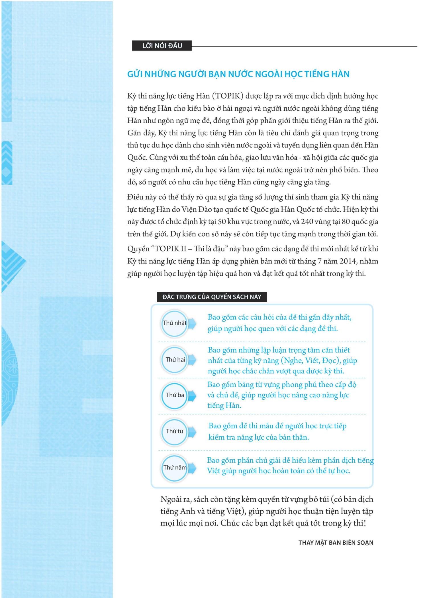 “TOPIK II - Thi là đậu” là giáo trình cập nhật mới nhất về kỳ thi và các dạng đề TOPIK II. Giáo trình cũng đáp ứng đầy đủ nhất yêu cầu của người muốn