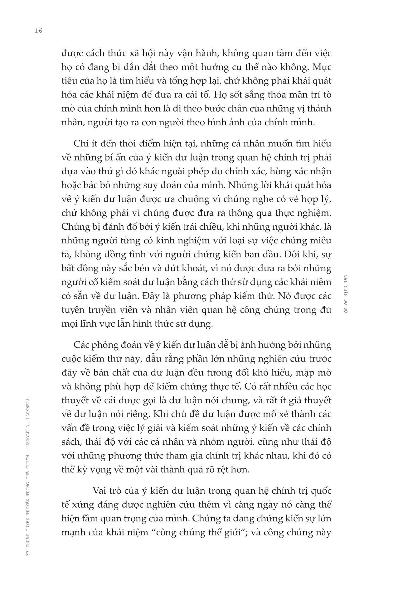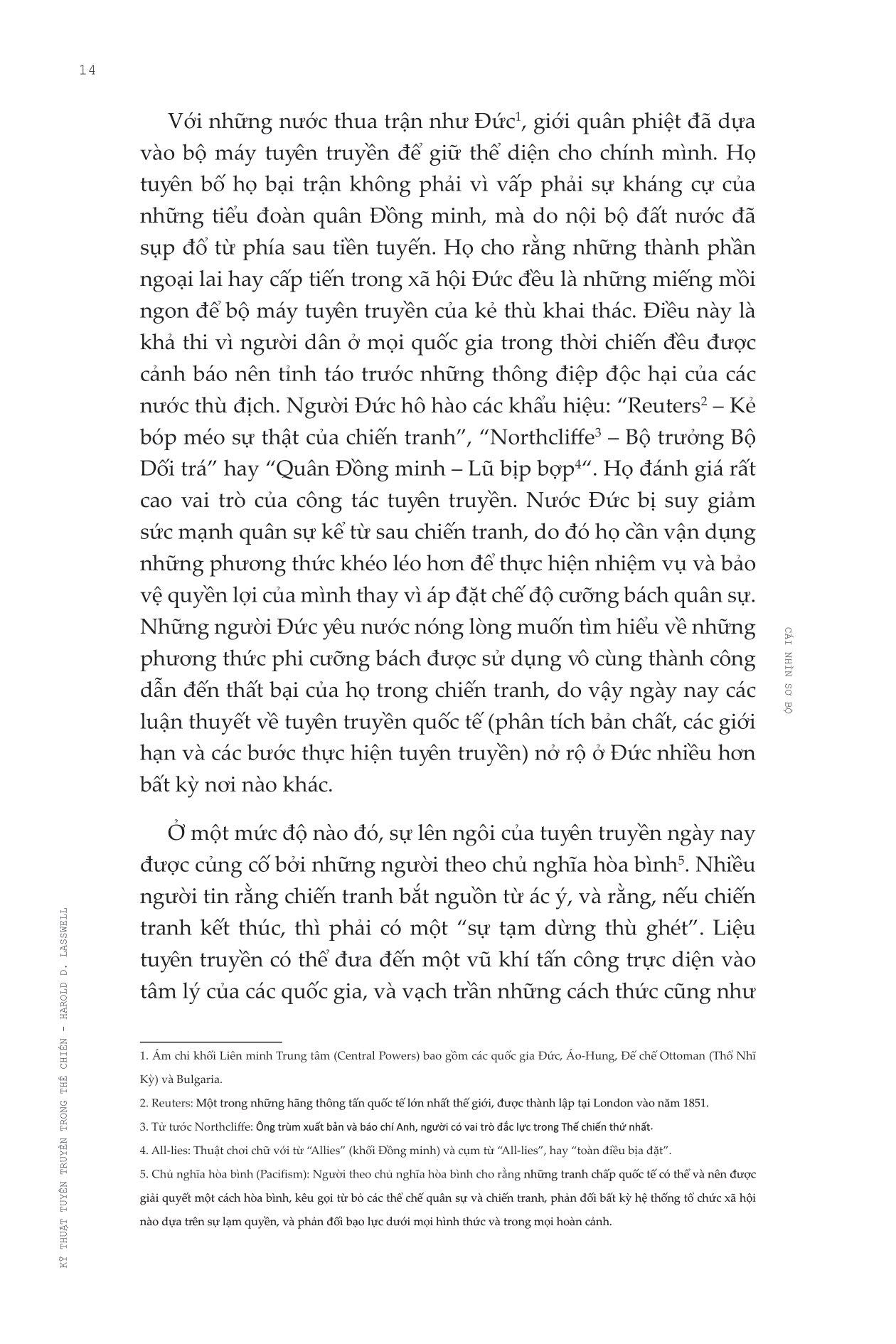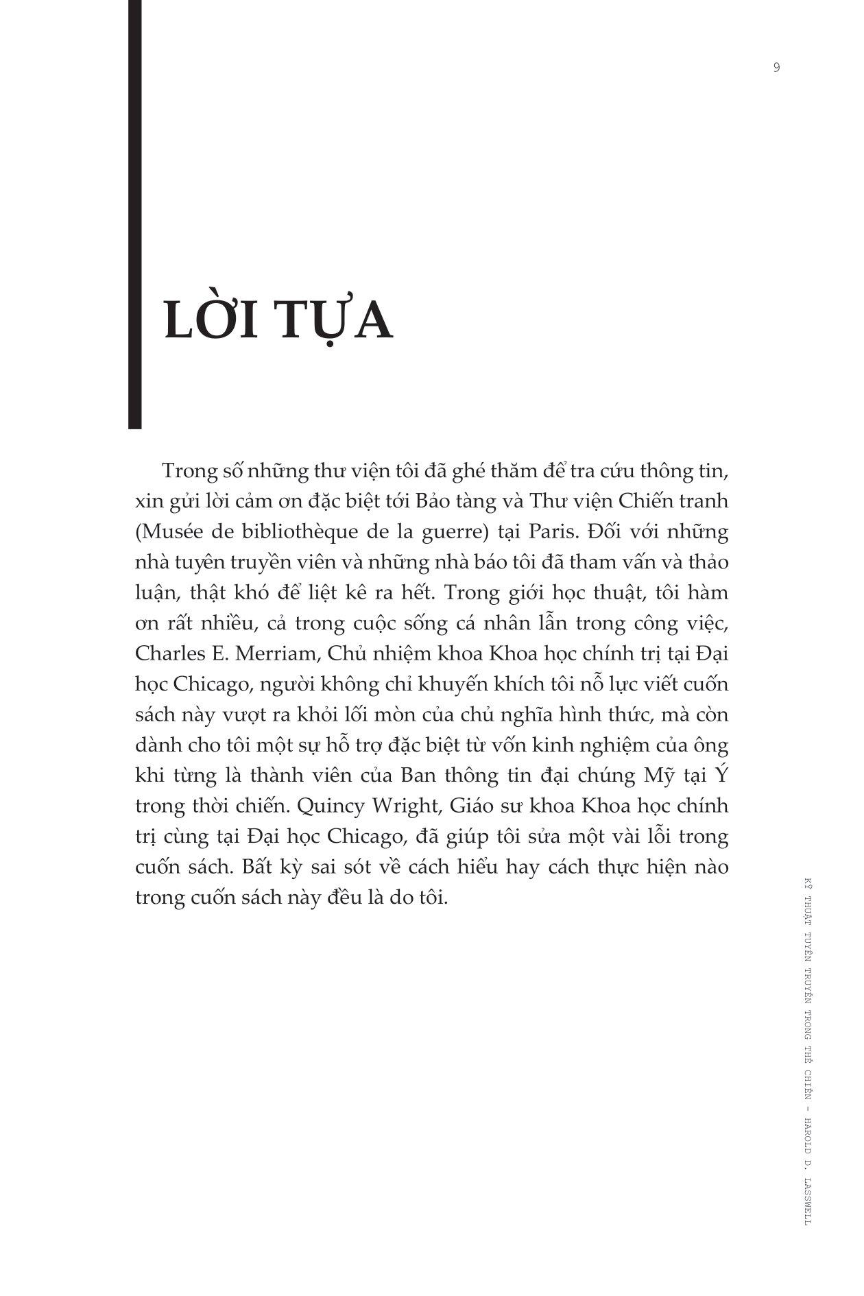 Kỹ thuật tuyên truyền trong thế chiến của Harold D. Lasswell tập trung vào việc phân tích định lượng và định tính nội dung tuyên truyền được các bên sử dụng trong hai thế chiến. Từ đó, ông đưa ra một số kết luận nổi bật, giúp người đọc hiểu rõ hơn chính sách tuyên truyền ảnh hưởng đến mọi khía cạnh của cuộc sống xuyên suốt thời chiến cũng như kết quả trực tiếp trên chiến trường như thế nào. Ngoài phân tích chuyên môn, Harold D. Lasswell còn sử dụng những phân tích liên ngành từ xã hội, lịch sử, tâm lý… nhằm lý giải cho sự ra đời cũng như thành bại của từng chính sách. Qua công trình nghiên cứu của Harold D. Lasswell, bạn đọc có thể tìm thấy những khuôn mẫu cũng như mô hình sơ khai sẽ đóng vai trò quan trọng trong quá trình hình thành lên nền tảng truyền thông hiện đại.