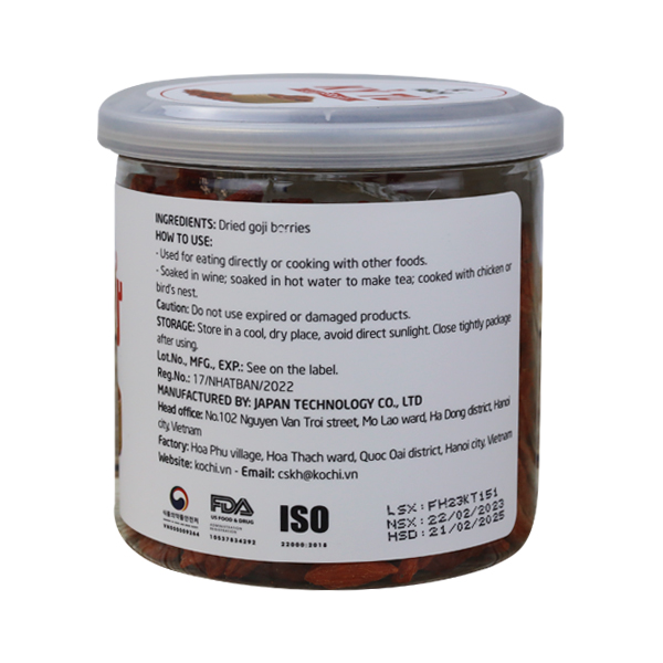 Khối lượng tịnh: 150g THÀNH PHẦN: - Kỳ tử sấy khô. HƯỚNG DẪN SỬ DỤNG: - Dùng trong trực tiếp hoặc chế biến các món ăn tùy theo sở thích. - Ngâm rượu, nấu cháo,