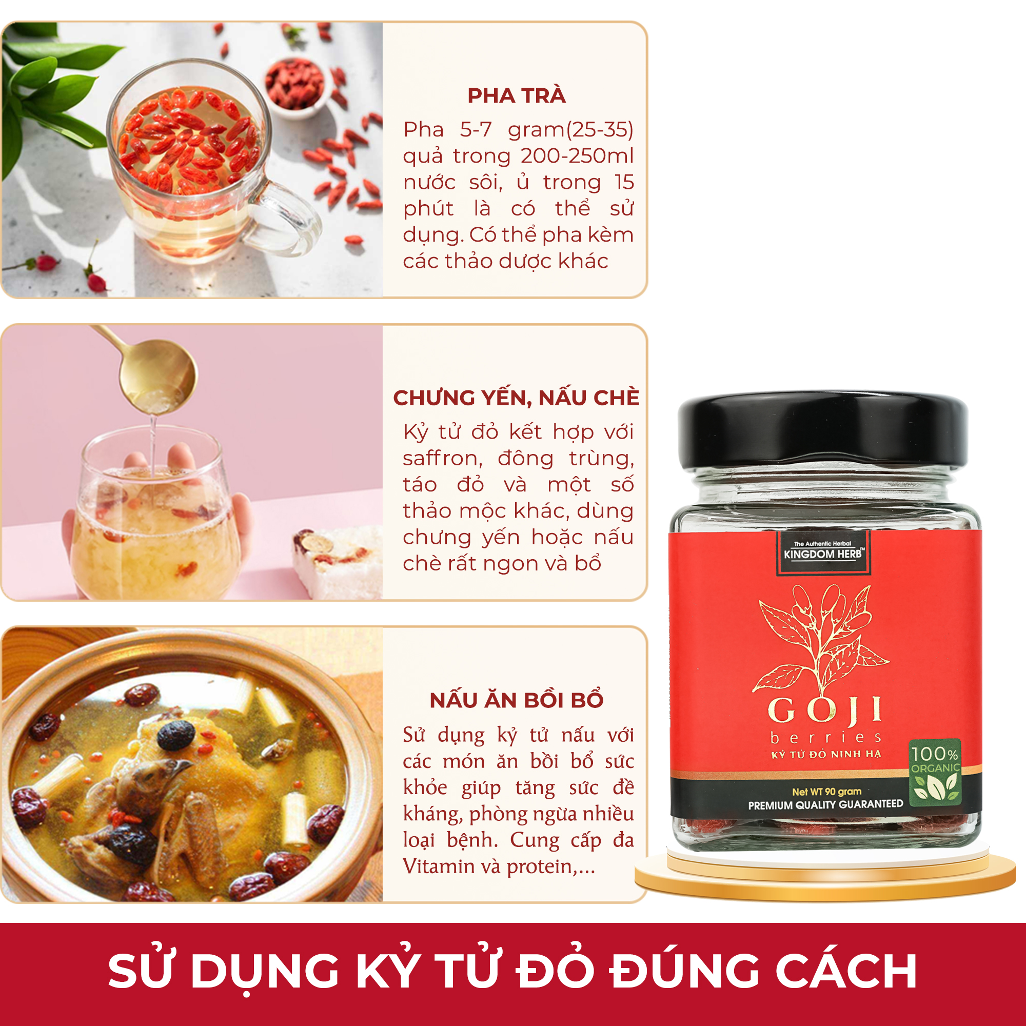 - Nói không với hàng xách tay kém chất lượng, trôi nổi trên thị trường Tại sao nên sử dụng kỷ tử hữu cơ Ninh Hạ Kingdom Herb: - Sản phẩm chất lượng nguồn giống tốt, không bị biến đổi gen, không gluten - Không sử dụng phân bón hóa học, thuốc bảo vệ thực vật - Không sử dụng thuốc kích thích tăng trường - Không phụ gia và chất bảo quản - Không nhuộm màu thực phẩm - Không tẩm đường và hương liệu - Không sấy nhiệt cao, giữ nguyên dưỡng chất