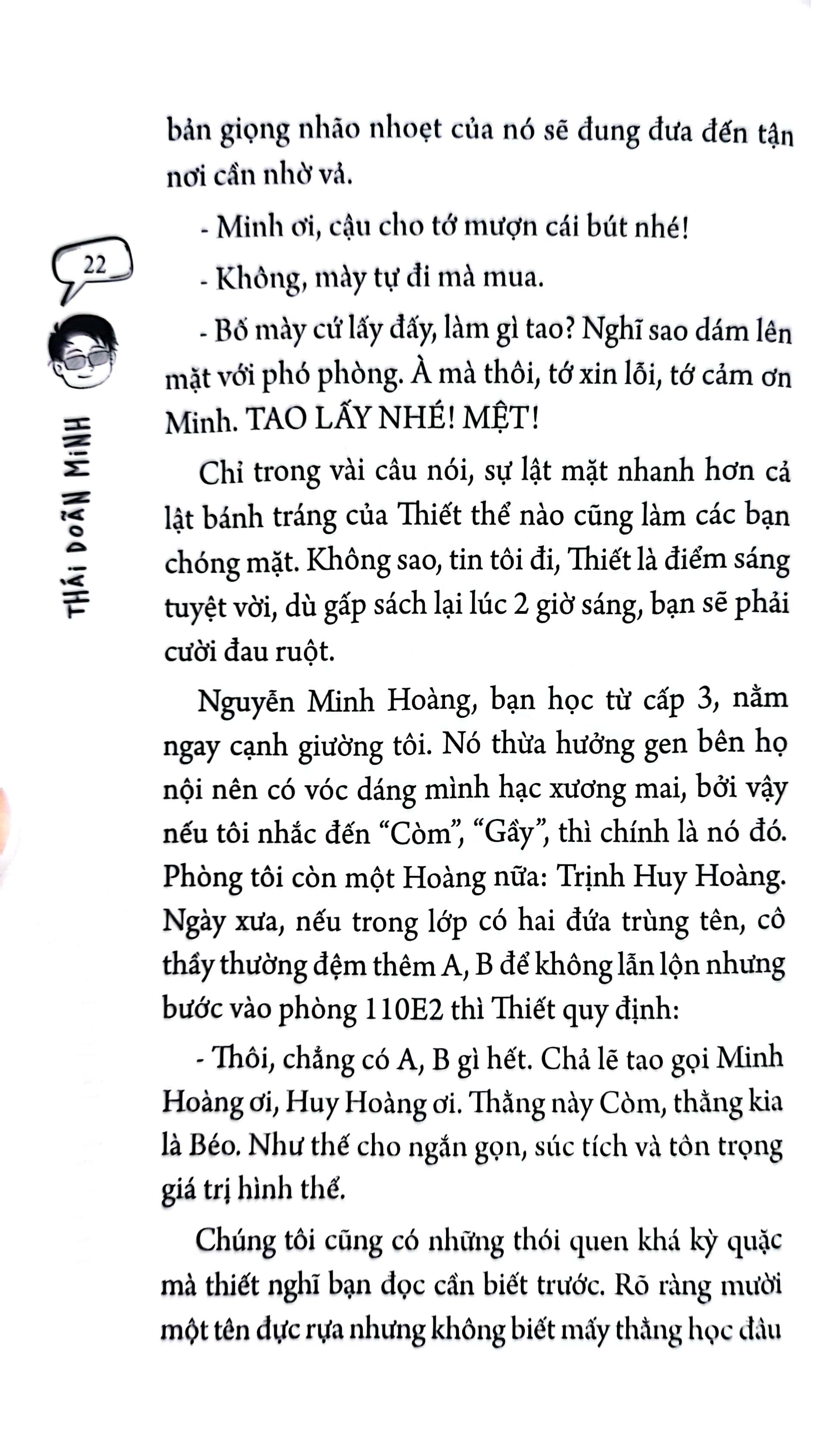 Sở dĩ tôi mong muốn được viết tới vậy, vì phòng ký túc xá của chúng tôi khá đặc biệt khi sở hữu toàn nhân vật “quái dị” với những câu chuyện không đầu, không cuối và luôn được chúng tôi hào hứng nhắc lại mỗi lần họp phòng. Nguyên tắc hoạt động của phòng gần giống như cách mà tôi có được những dòng này vậy đó: đề đạt nguyện vọng đầy lịch sự, nếu không được đồng ý thì tự m.ình hành sự. Thế mà chừng ấy con người vẫn chung sống và tu luyện hòa thuận suốt 6 năm trong “ngôi nhà chung” (thuật ngữ trích từ Việt Nam Nếch - tóp - mo - đồ), với chỉ đôi ba lần sứt đầu mẻ trán. Ở đó, 110E2 được lãnh đạo bởi một “cô” Thiết phó phòng quyền lực nhưng nói không đi đôi với làm; một “thánh” Vượng chuẩn mực trong lối sống và học hành; một cậu Đạt thích tâm linh; một ông Hoàng Béo đam mê lịch sử và hay hờn dỗi; một Hùng – trưởng phòng “danh dự” trang bị toàn diện bộ kĩ năng sống; một cậu Thình hết m.ình với ngôn ngữ học; một cậu Dũng thích kể chuyện nhạt; một cậu bé Tuyên thích cười duyên khiêu khích; một bạn Thế hiền lành sao cũng được; và chúng tôi nữa, cặp bài trùng Minh Cá và Hoàng Còm sở hữu bộ lưỡi bán cả thiên hạ. Tất nhiên, sự biến động nhân sự trong 6 năm học là không tránh khỏi. Những sự bổ sung chất lượng như: em Ba Duy bóng bẩy giàu lòng trắc ẩn, ông em Thanh mọt sách, ông anh Bình cam chịu hay ông anh Khánh nghệ sĩ… Tất cả những con người ấy hòa thanh hoàn hảo như bản nhạc hiệu của chương trình Gặp nhau cuối tuần mỗi khi tôi nghĩ về.