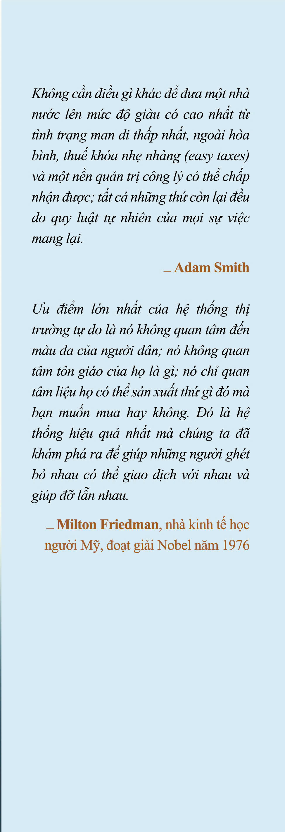 Cùng với đó là phần Phụ lục trích dịch 2 tác phẩm quan trọng nhất của ông - Sự phồn vinh của các quốc gia và Lý thuyết về tình cảm đạo đức. Trong gần 600 trang sách, các tác giả đã phác họa lại cuộc đời, bối cảnh lịch sử thời Adam Smith sinh sống, những yếu tố góp phần hun đúc nên tư tưởng quan trọng của ông; bên cạnh đó, các tác giả đã phóng chiếu, bàn sâu về sự ảnh hưởng của ông lên lý thuyết kinh tế thế giới, cho thấy tư tưởng vượt thời cùng những cấp tiến bên trong bộ óc lỗi lạc.