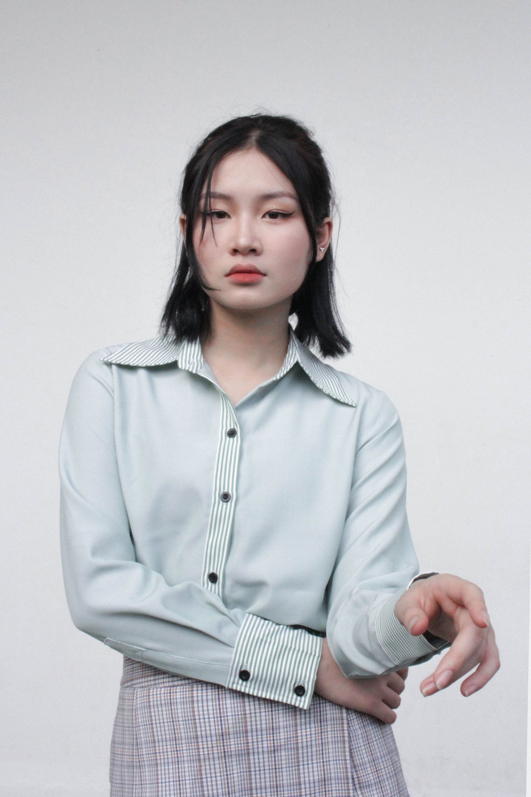 CHẤT SOMI COTTON PHA, MỀM ĐỨNG PHOM ÁO MÀU XANH LÁ ÁO CỔ SOMI, TAY DÀI, NÚT ĐEN PHOM CĂN BẢN SUÔN ĐIỂM NHẤN PHẦN LÁ CỔ, NẸP ÁO, MANGSET BẰNG VẢI HOẠ TIẾT KHÁC