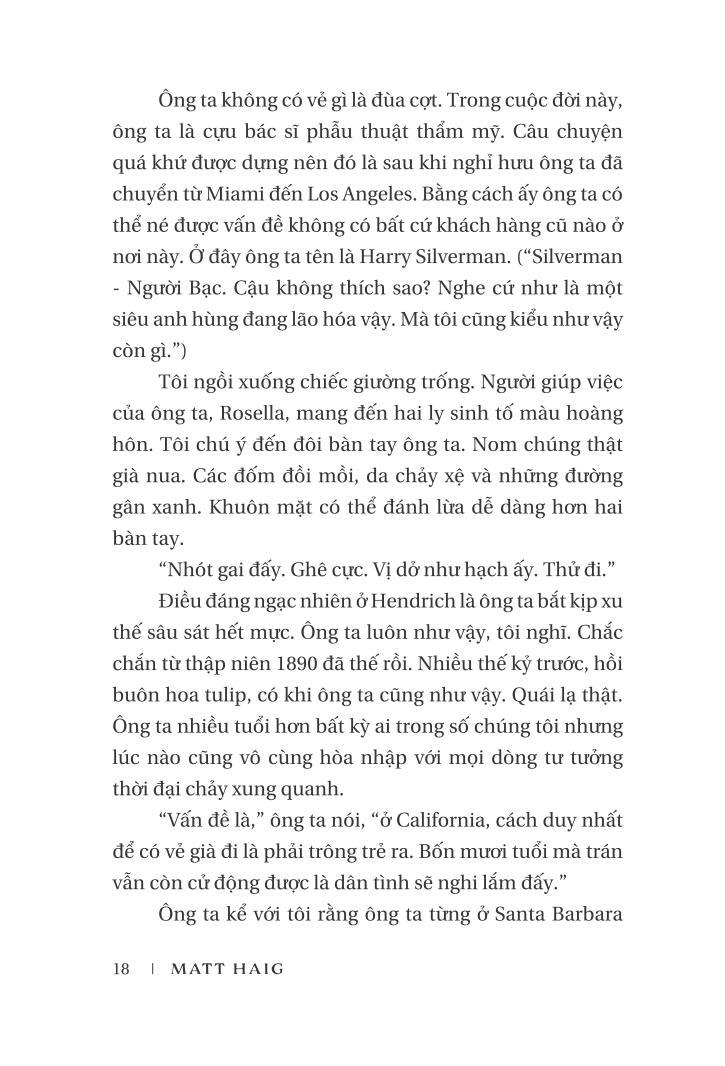 Trong suốt hơn bốn trăm năm cuộc đời, Tom đã mục sở thị vô số cột mốc của lịch sử nhân loại, đã biểu diễn cạnh Shakespeare, uống cocktail với Fitzgerald, lênh đênh ngoài khơi cùng thuyền trưởng Cook, đã sống “bình ổn” dưới sự bảo trợ của một tổ chức bí mật. Nhưng giờ đây một bước ngoặt xảy đến khiến anh phải đứng trước lựa chọn: tiếp tục thả minh nổi trôi giữa biển đời hay liều lĩnh một lần để thực sự yêu và sống.